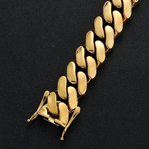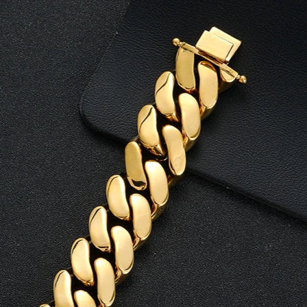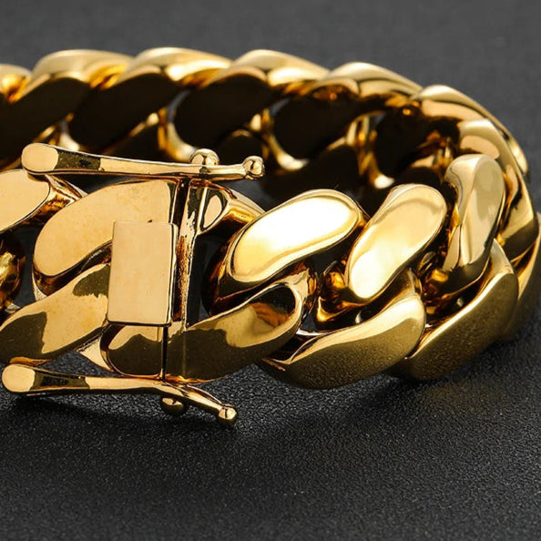سوار كوبن عريض (22 مم) مصنوع من ستانلس ستيل فاخر مقاوم للخدش، مطلي بالذهب بلمعة مرآوية. متوفر بطول 8 و9 إنش، مع قفل صندوقي مدعّم بأذرع أمان مزدوجة. قطعة جريئة تجسد الفخامة الحديثة وقوة الحضور.