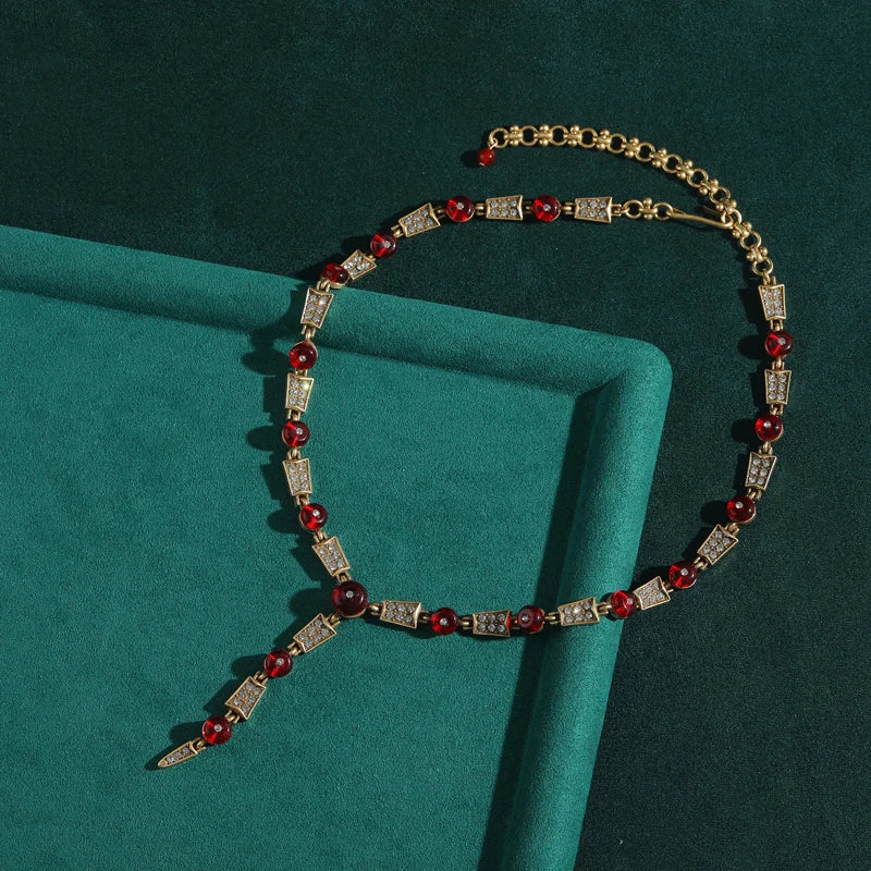 فيلتوري Rubivine يجسّد أناقة عتيقة تنبض بالحركة. بتصميمه على شكل Y، يتألّف العقد من كريستالات حمراء بدرجة الياقوت وأحجار زركون مرصوفة بلمعان متناسق. مطلي بالذهب العتيق عيار 24 قيراط لإطلالة فاخرة تجمع بين الشغف والتراث والفن الرفيع.