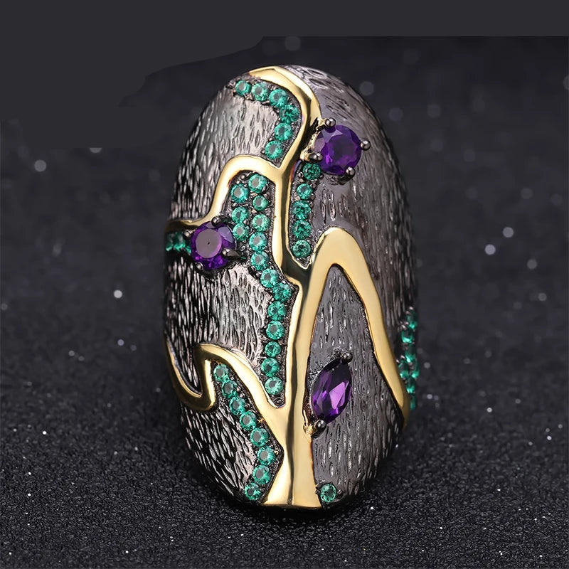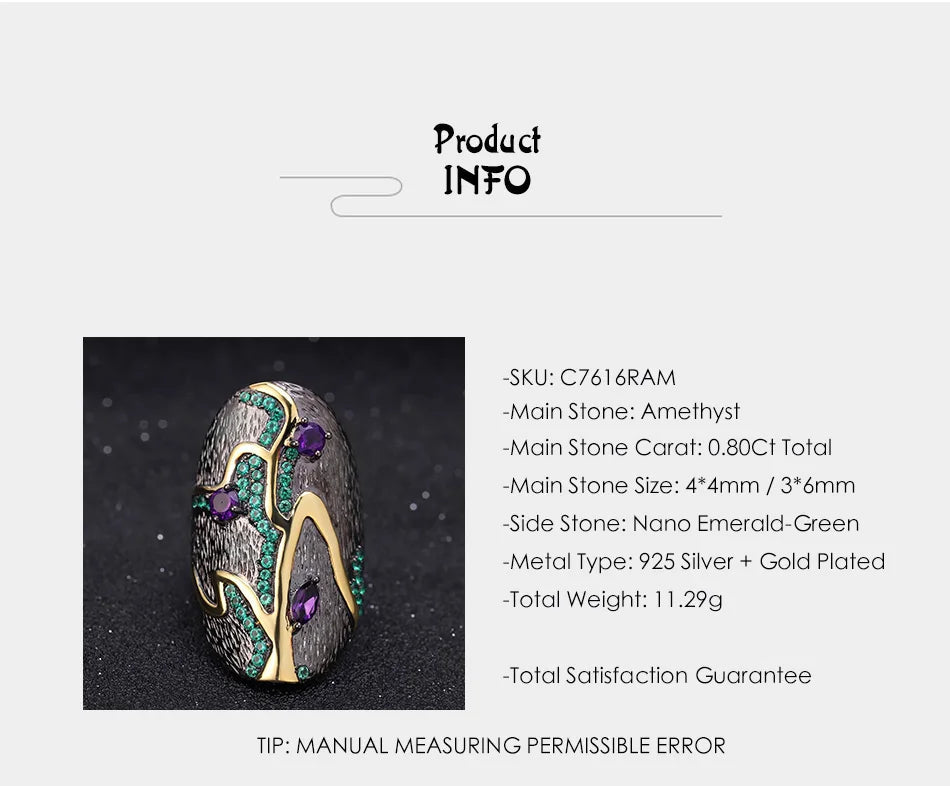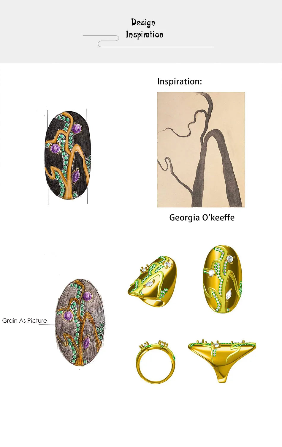 فيلتوري أوكيف تُجسّد تحيةً شعريةً للجمال العضوي - خاتمٌ نحتيٌّ مستوحى من منحنيات الأوراق الهادئة وروح فن جورجيا أوكيف الطبيعي. صُنع الخاتم يدويًا من الفضة الإسترلينية عيار 925 بلمسةٍ من الذهب، ويتميّز بحجر جمشت طبيعيّ بوزن 0.80 قيراط بتقطيعاتٍ متناسقة، مُرصّع بأوراق زمرد نانوية تتلألأ كأمطار الربيع.
