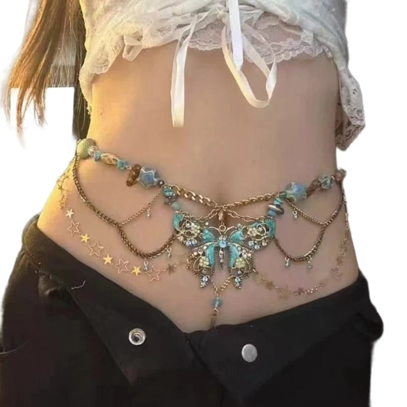 سلسلة خصر متعددة الطبقات تتوسطها فراشة مزينة بكريستالات زرقاء وخرز متدلي. قطعة أنيقة ومرنة يمكن ارتداؤها على الخصر أو الورك، تمنح إطلالة جريئة ومبهرة للسهرات والمناسبات أو لإبراز ثقة أنثوية يومية.