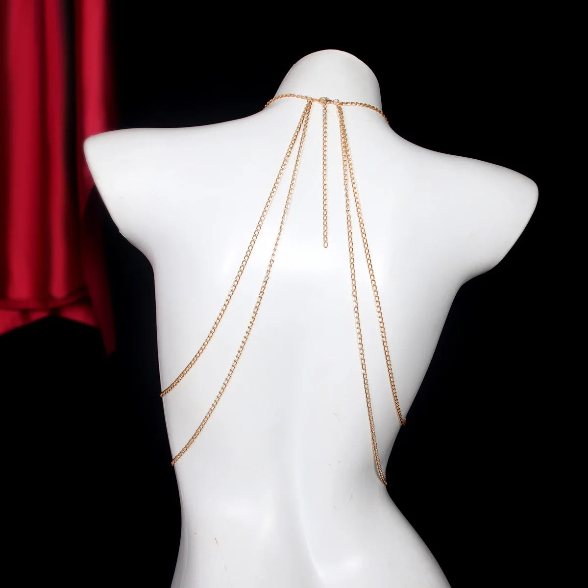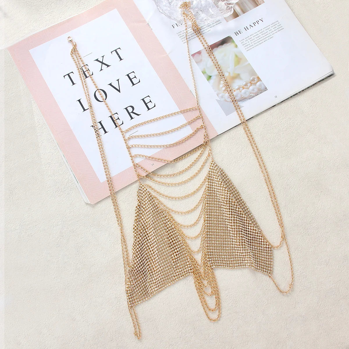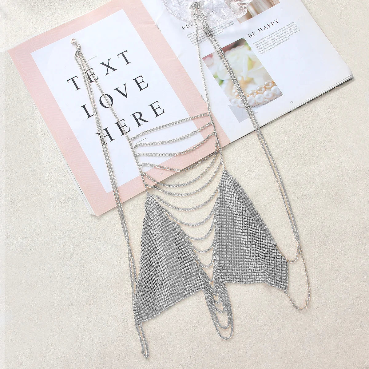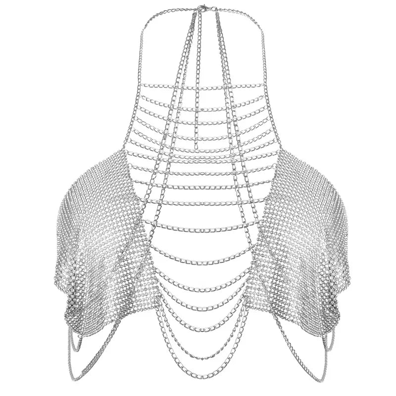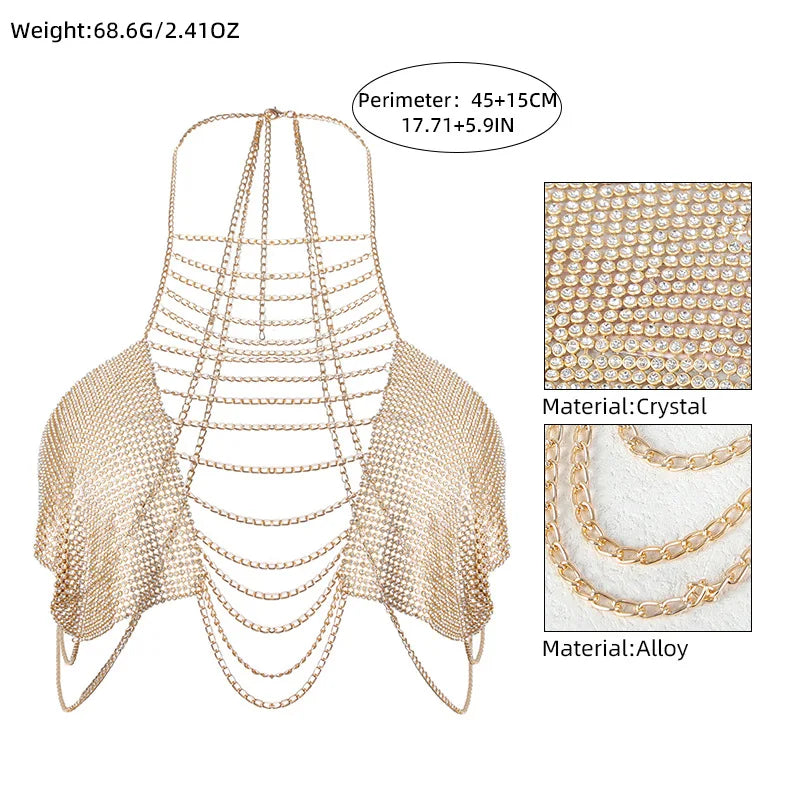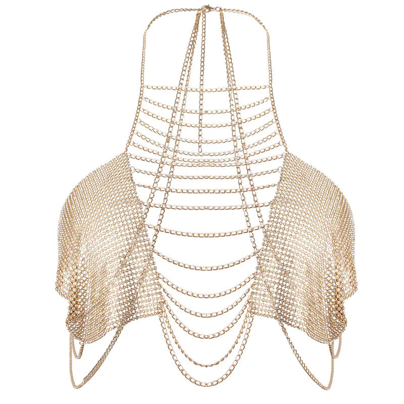 قطعة صدرية فاخرة باللون الذهبي، منسوجة بسلاسل متدرجة وكريستالات مقطوعة بدقة. تحتضن القوام بانسيابية جريئة وتضيء مع كل حركة. مصممة لإطلالات السهرات وحفلات السطوح وليالي الأناقة المتمردة.