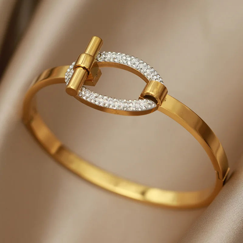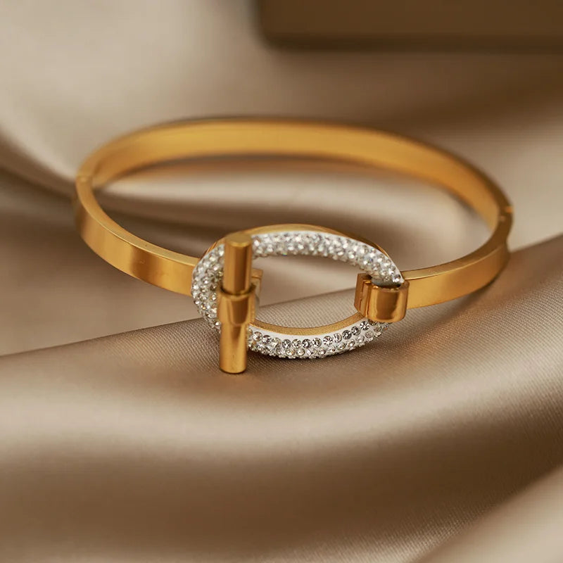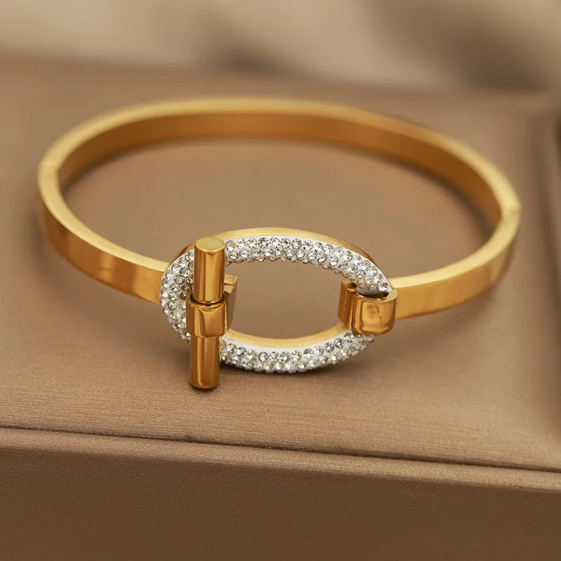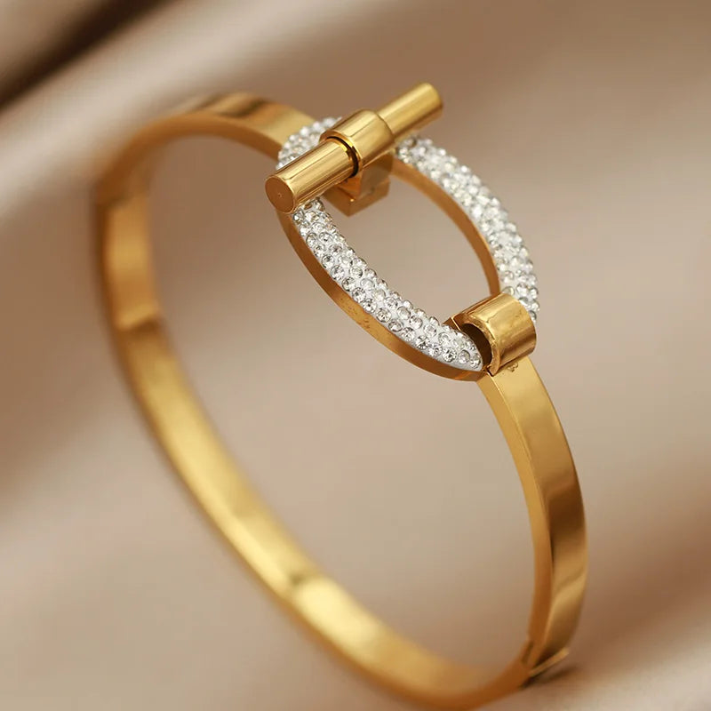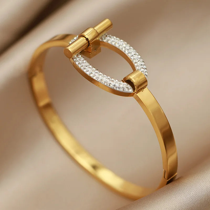 إسوارة فاخرة مصنوعة من ستانلس ستيل مطلي بذهب 18 قيراط، يزين مركزها البيضاوي كريستالات لامعة تعكس الأناقة والقوة معًا. خفيفة، مضادة للصدأ، آمنة على البشرة، لترافقك بتألق يومي خالد.