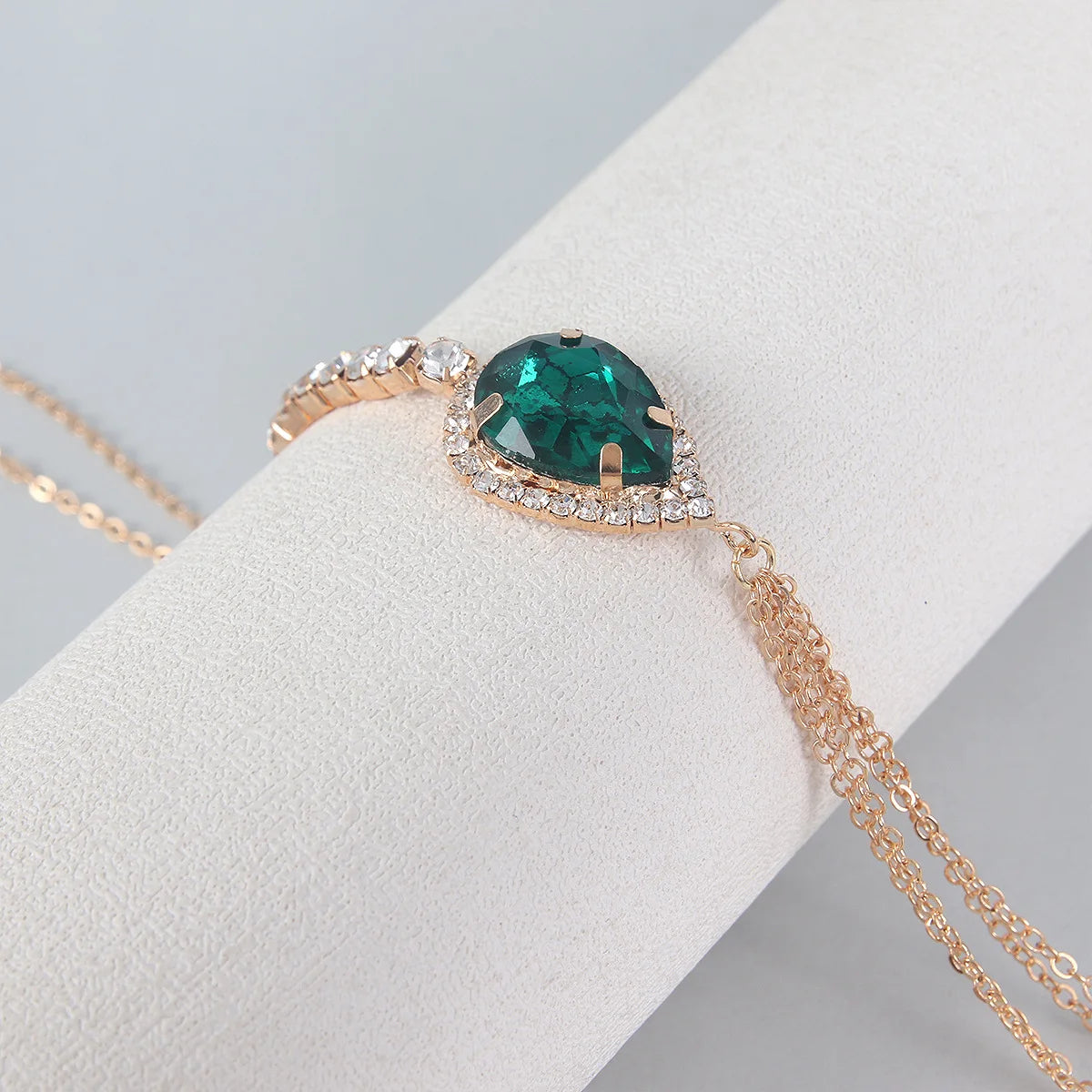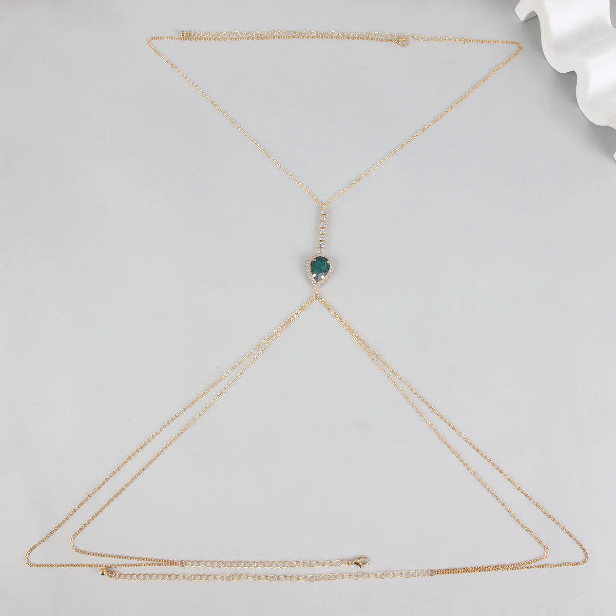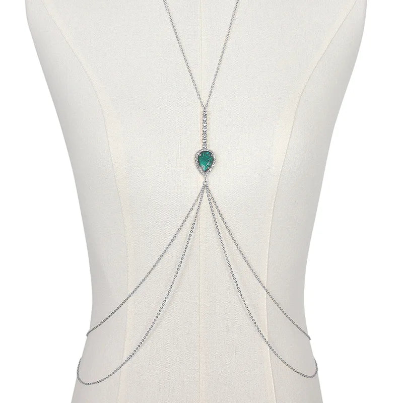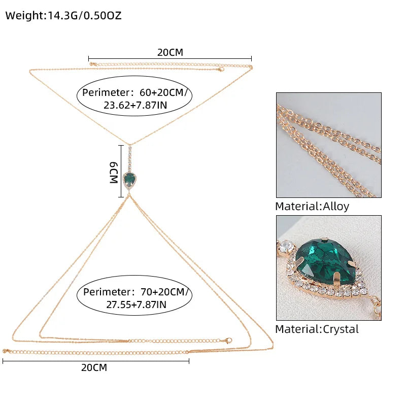 سلسلة صدر مستوحاة من الطراز الريترو، تتألق بحجر كريستال زمردي على شكل دمعة محاط بلمعات براقة. تنسدل من الرقبة حتى الخصر بانسيابية جريئة — مثالية لإطلالات الشاطئ أو الفساتين العميقة أو المناسبات التي تحتاج جرأة أنيقة.
