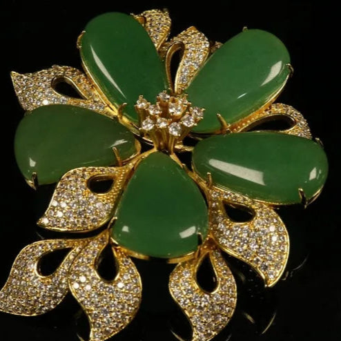 بروش كلاسيكي مستوحى من القصور الملكية العتيقة، مزين بأحجار كريمة زاهية على شكل دمعة - حمراء، بنفسجية، زرقاء، أو خضراء - محاط ببتلات زركون مرصعة. قطعة فاخرة مميزة، مثالية للفساتين، والسترات، والأوشحة، تنبض بأناقة خالدة وسحر ملكي.