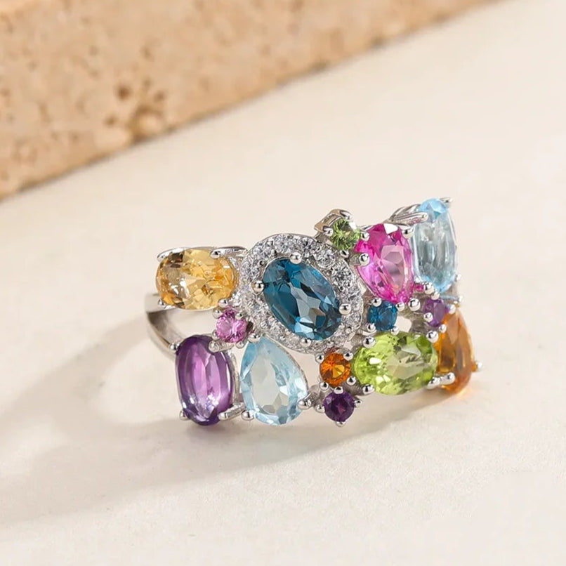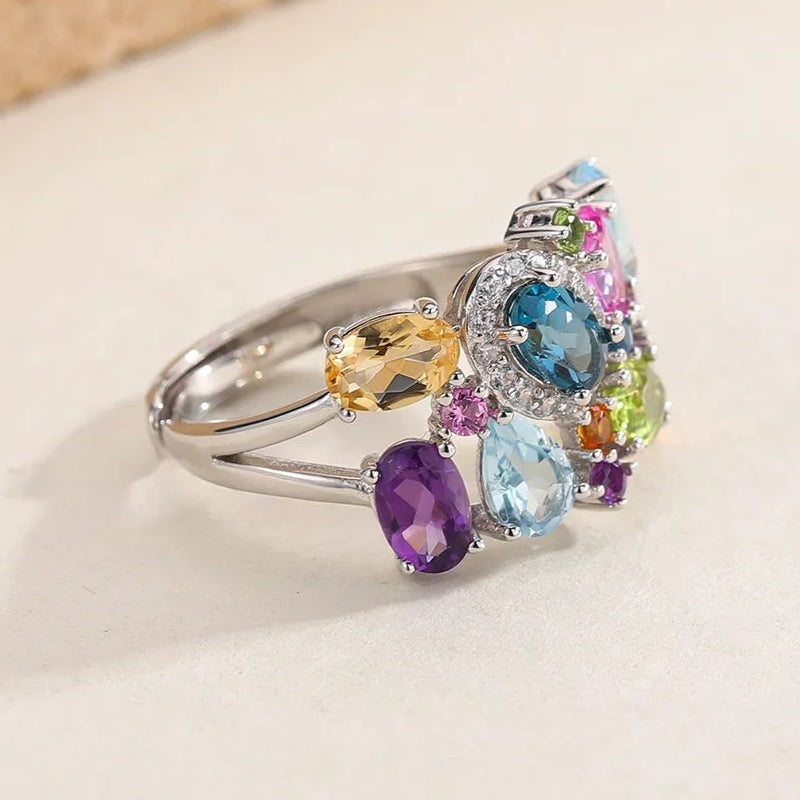 فيلتوري أرمونيا هو طيف الطبيعة، برؤية جديدة - خاتم كوكتيل مصنوع يدويًا من الفضة الإسترلينية عيار 925، مرصع بمزيج متألق من الأحجار الكريمة الطبيعية، بما في ذلك السترين والجمشت والزبرجد والتوباز. بفضل تصميمه المستوحى من النباتات ومقاسه القابل للتعديل، يجمع هذا الخاتم بين الحيوية والبراعة الفنية وبهجة الألوان.
