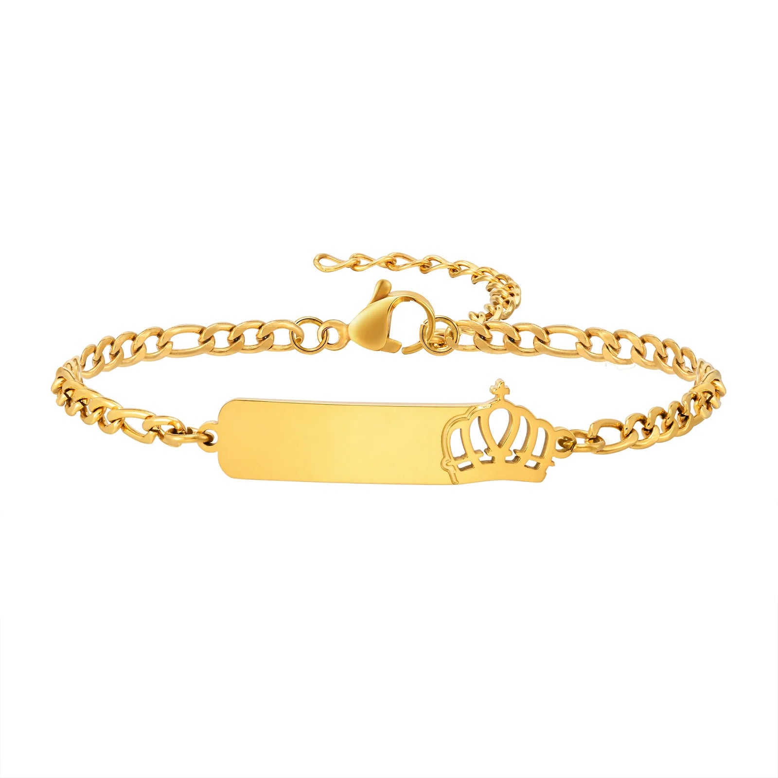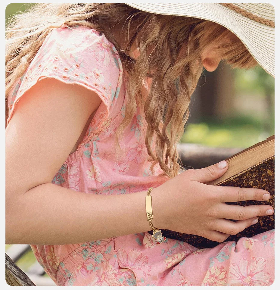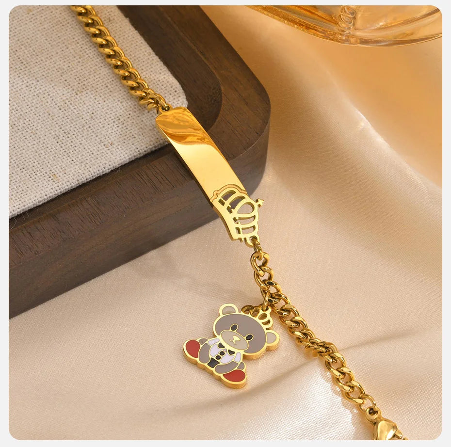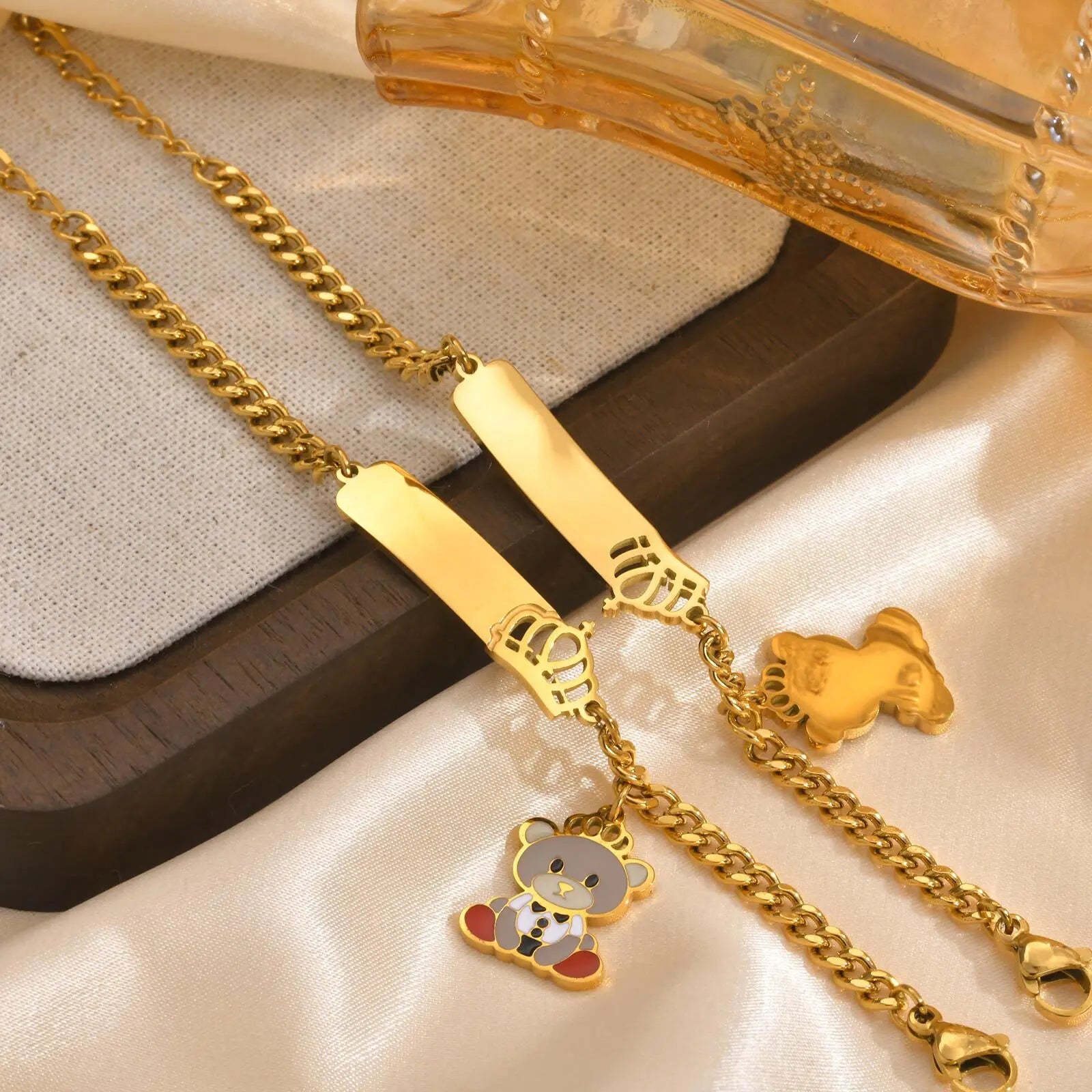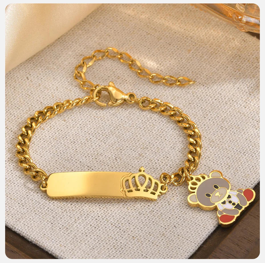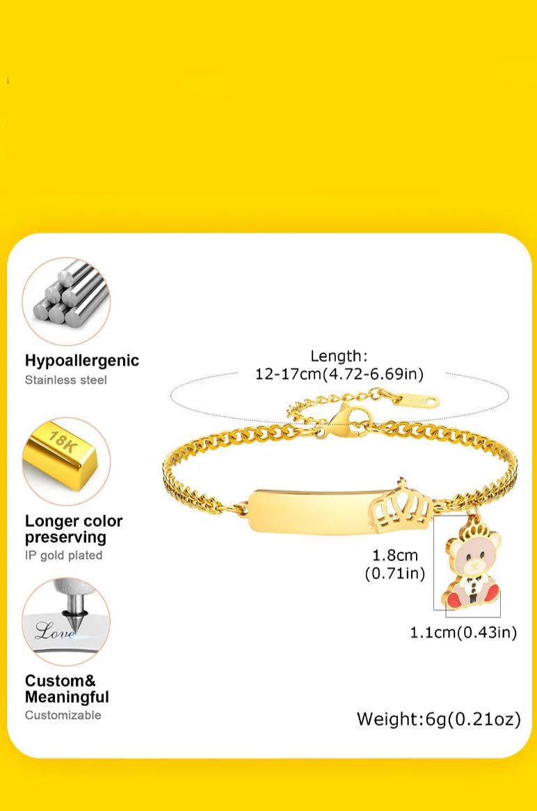 سوار الأطفال الذهبي بتصميم دب متوج مصنوع من الفولاذ المقاوم للحساسية مع طلاء ذهبي أنيق. قابل للتخصيص بالاسم أو تاريخ الميلاد، ويأتي بمقاس قابل للتعديل لينمو مع الطفل. هدية خالدة تحتفظ بالحب في كل مناسبة.