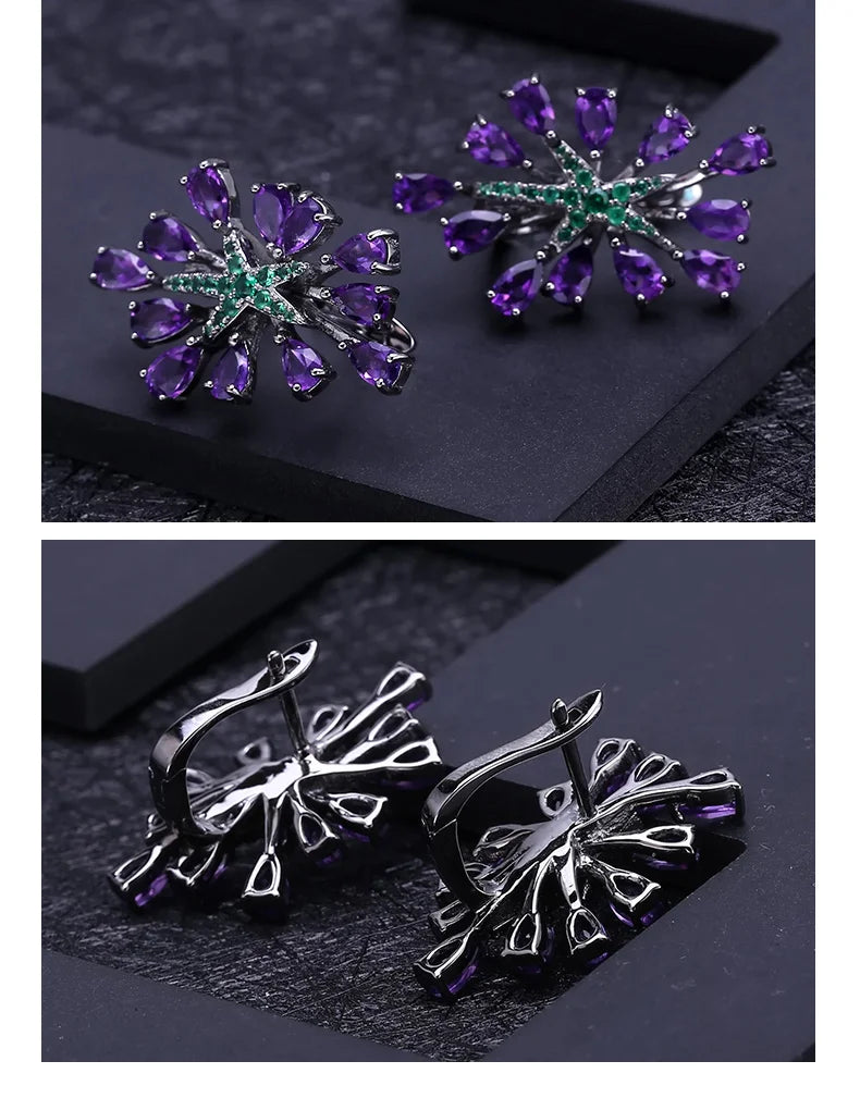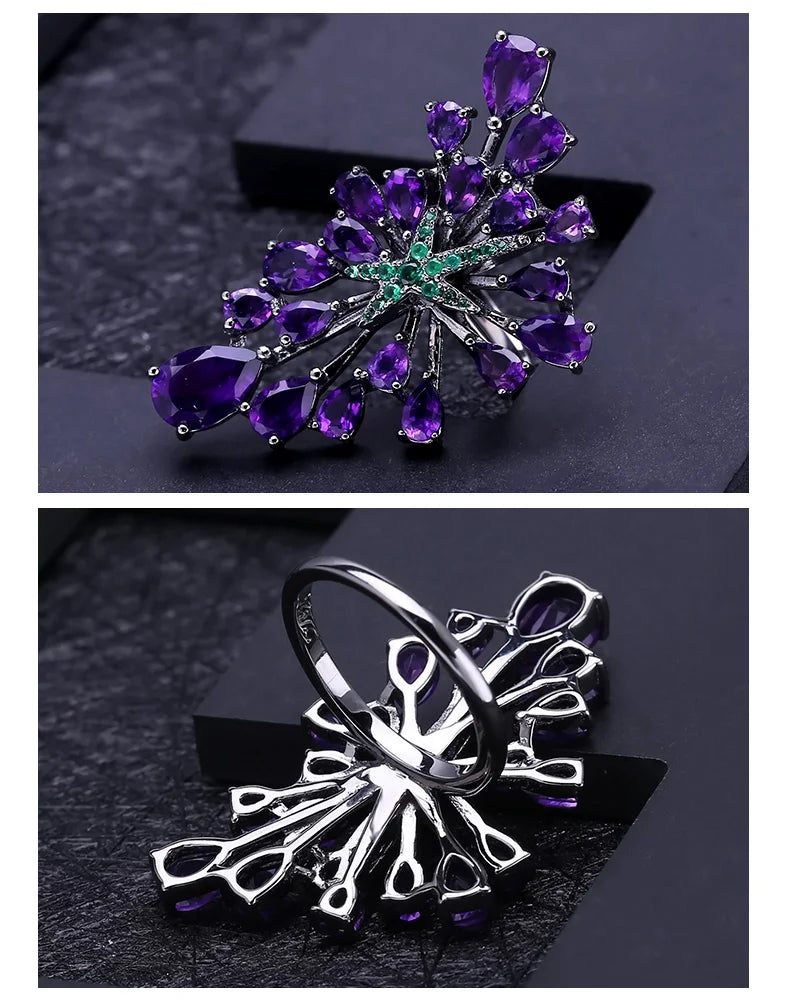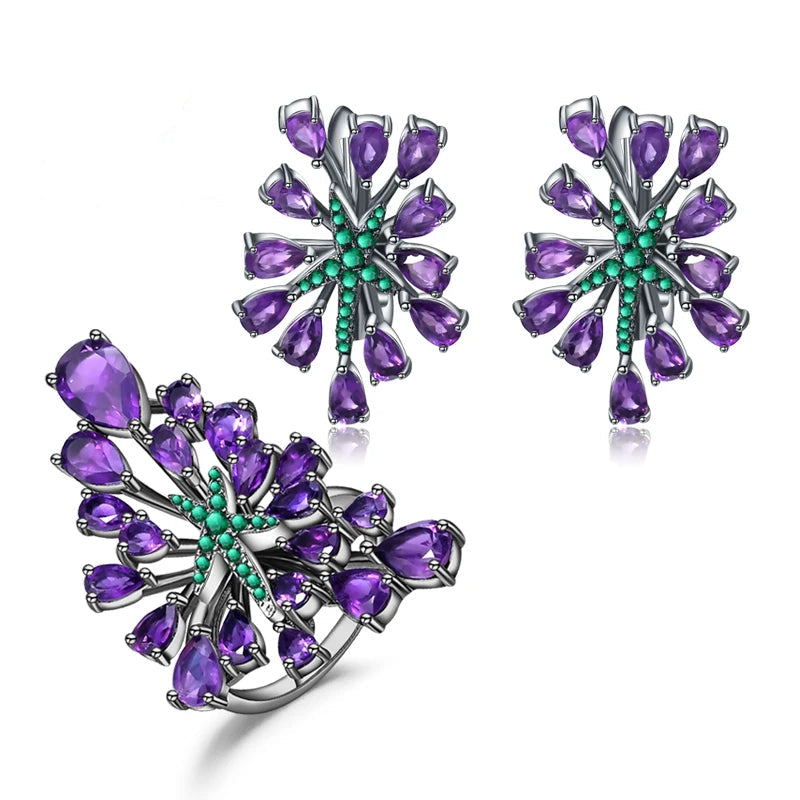 فيلتوري تينبرا همسةٌ في شفقٍ ساحر - طقم مجوهرات مستوحى من الطراز القوطي، يتألف من خاتم وأقراط متطابقة، مصنوعان من الفضة الإسترلينية عيار 925، ومرصّعان بأحجار الجمشت الطبيعية بتقطيعات دقيقة. ترسم أحجار الزمرد النانوية مساراتٍ خفيةً من التألق، مضيفةً تباينًا وغموضًا إلى كل منحنى.
