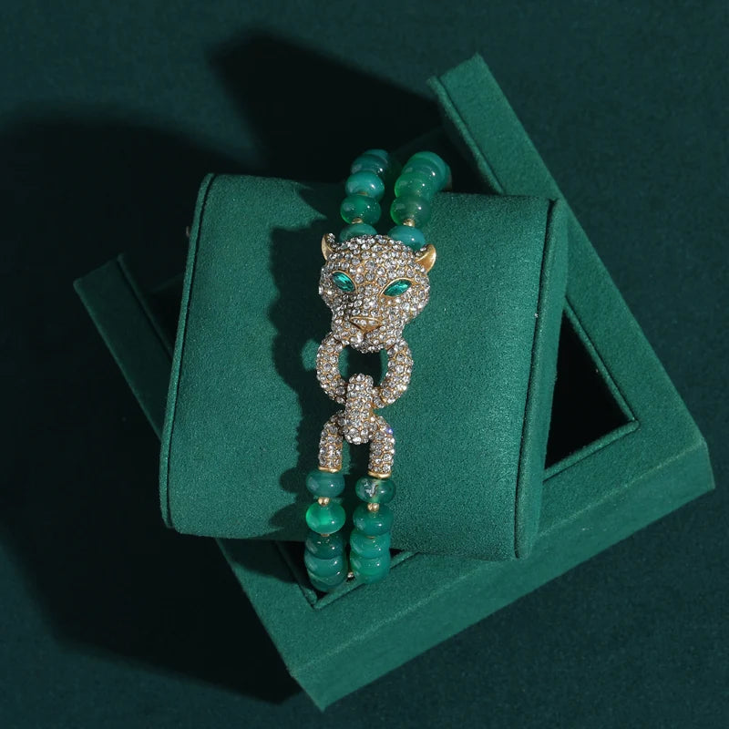 سوار فاخر مشغول يدوياً من خرز العقيق الأخضر، يتوسطه رأس فهد مرصع بكريستالات براقة وعيون خضراء زمردية. مطلي بالذهب العتيق ليمنحك قطعة Statement استثنائية تجمع بين القوة والجاذبية والأناقة الخالدة.