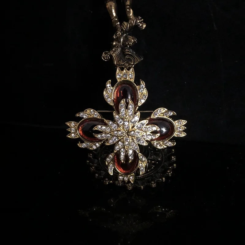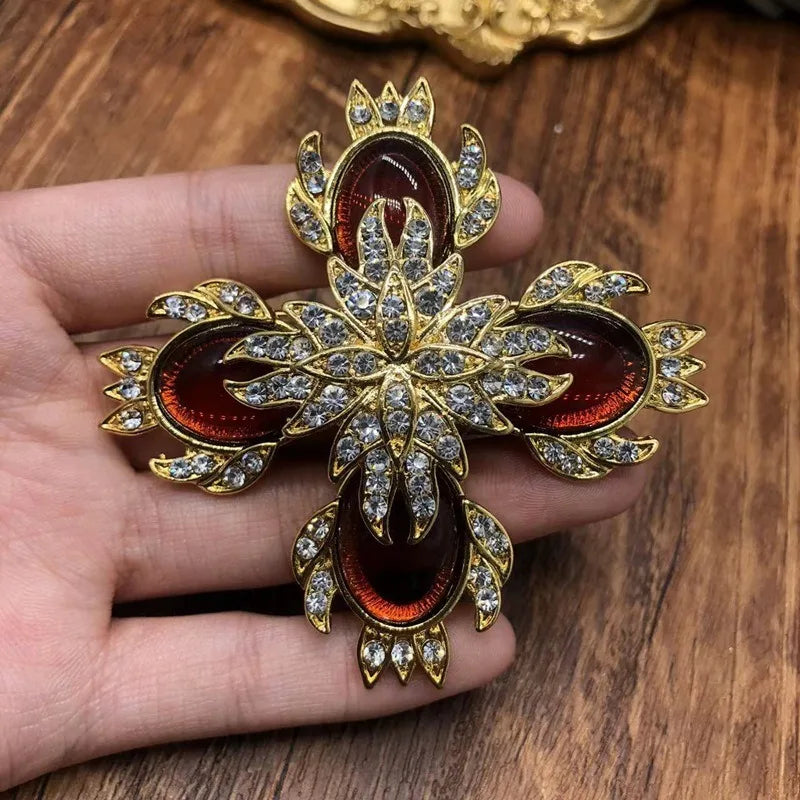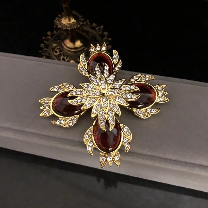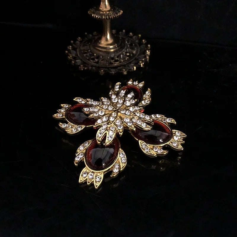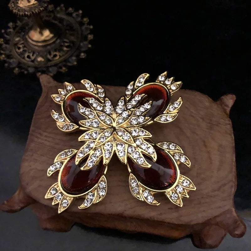 روزاليا يتألق بفخامة عتيقة مع حجر أحمر عميق في المركز محاط بزركونات لامعة. تصميم زهري مطلي بالذهب مستوحى من القصور ليمنح إطلالة مهيبة تناسب البدلات الرسمية، الأوشحة، والهدايا الفاخرة التي تدوم بخلودها.