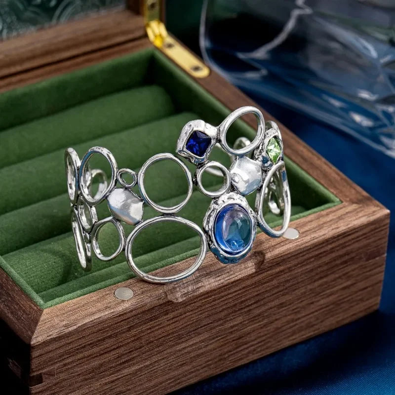 سوار مفتوح من ستانلس ستيل مطلي بالفضة، مرصع بأحجار CZ زرقاء وخضراء بتثبيت Bezel. تصميمه المجوف يوازن بين الجرأة والفخامة، ليصبح قطعة Statement مثالية للأمسيات الفاخرة والإطلالات الفنية المتفردة.