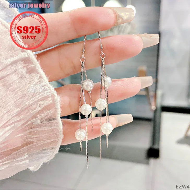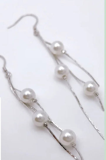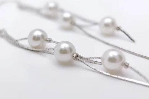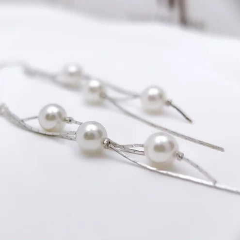 أقراط متدلية طويلة من الفضة الإسترلينية 925 الأصلية، بطول 75.5 مم، مرصعة بكرات لؤلؤية ناعمة (6.3 مم). بوزن خفيف ~2.96 جم يمنحك راحة وأناقة متحركة مع كل التفاتة، لتجمع بين الفخامة الكلاسيكية واللمسة العصرية.