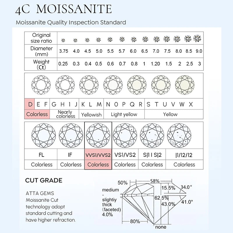 Main Stone: Certified 1CT Round Brilliant Moissanite (GRA-authenticated, Hearts & Arrows cut)