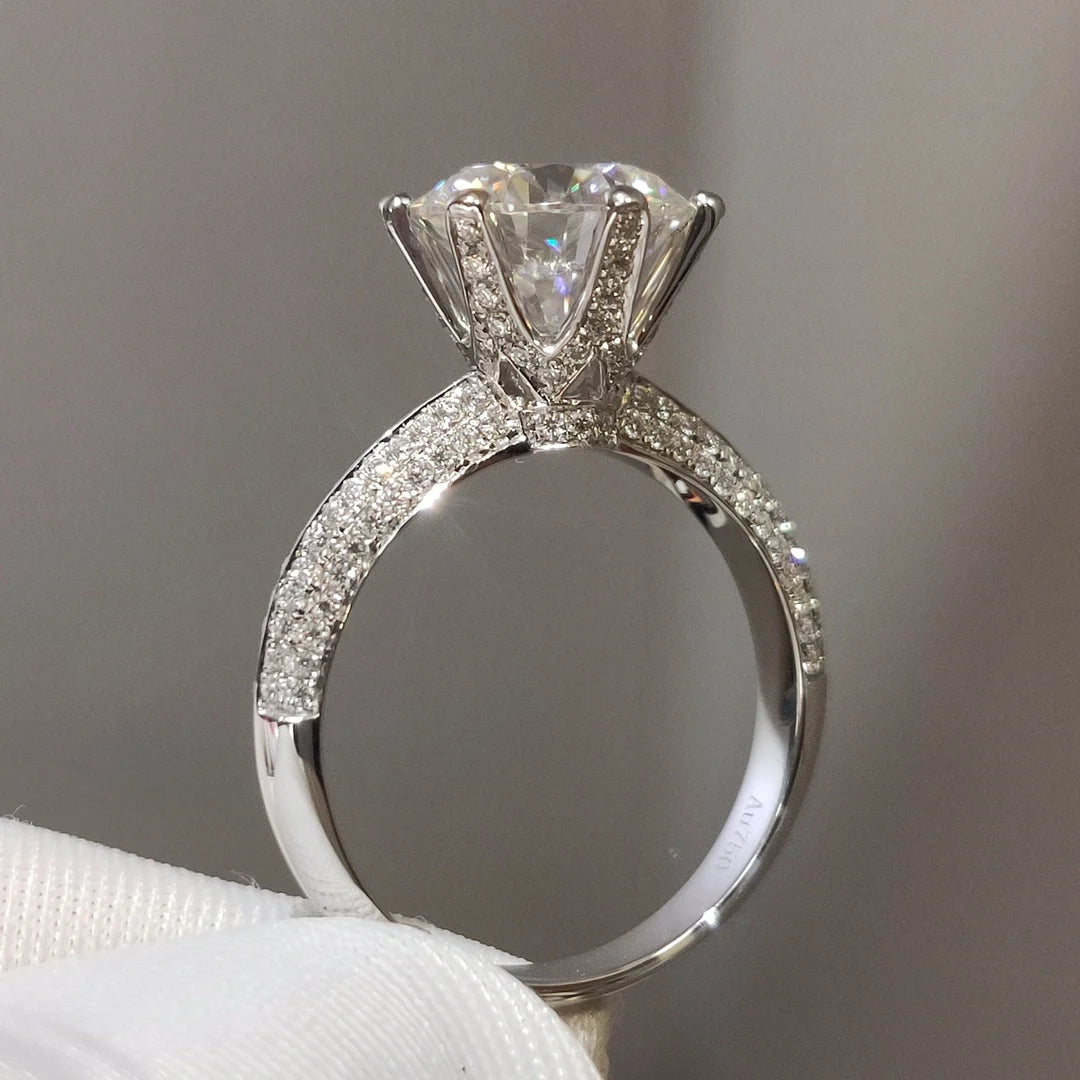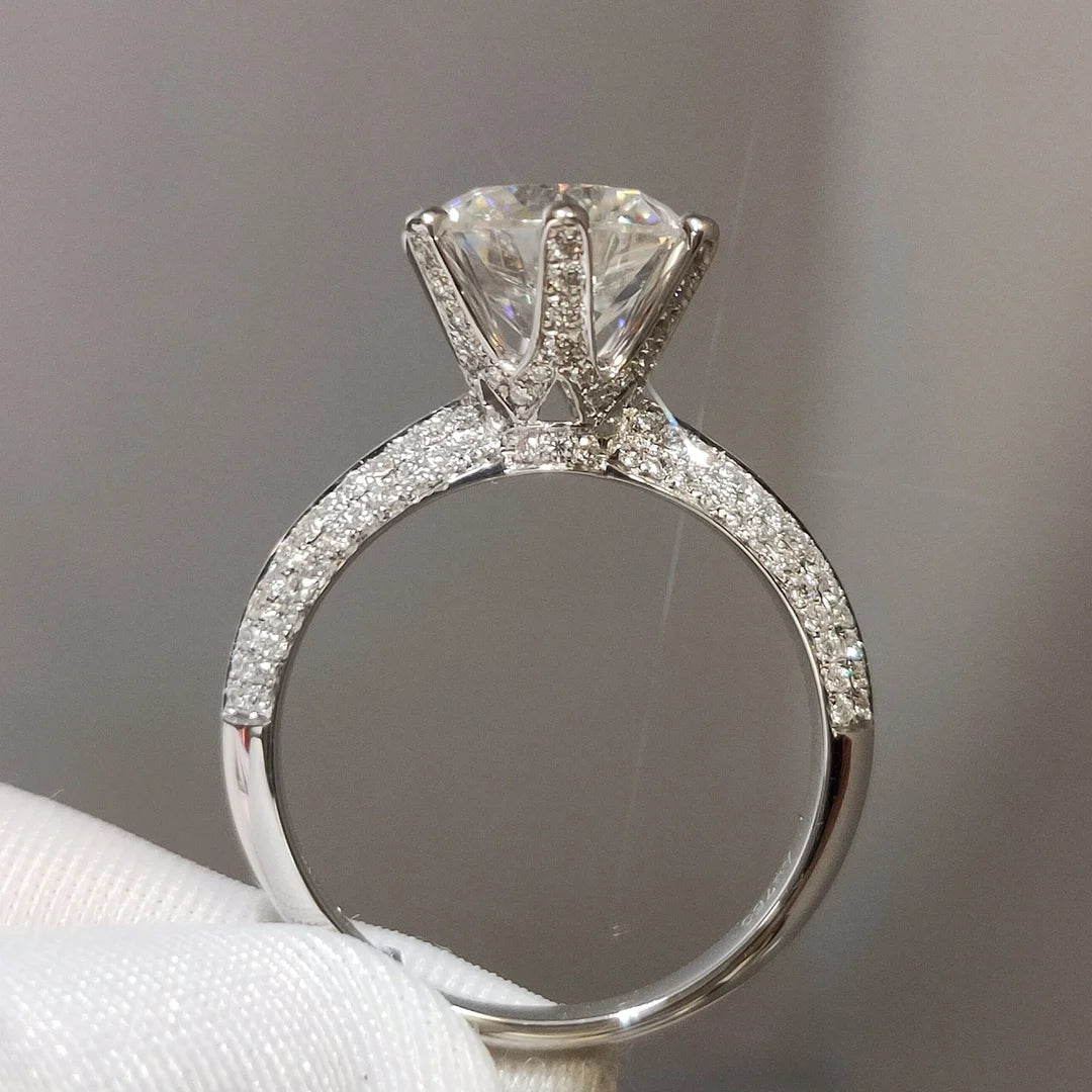 Crafted in solid 925 sterling silver with a mirror finish, this ring radiates with a 3CT D-color VVS1 moissanite, prong-set to reveal its fire. The band shimmers with pavé-set accents, elevating its grandeur. Certified brilliance that passes the diamond test — a jewel of prestige.