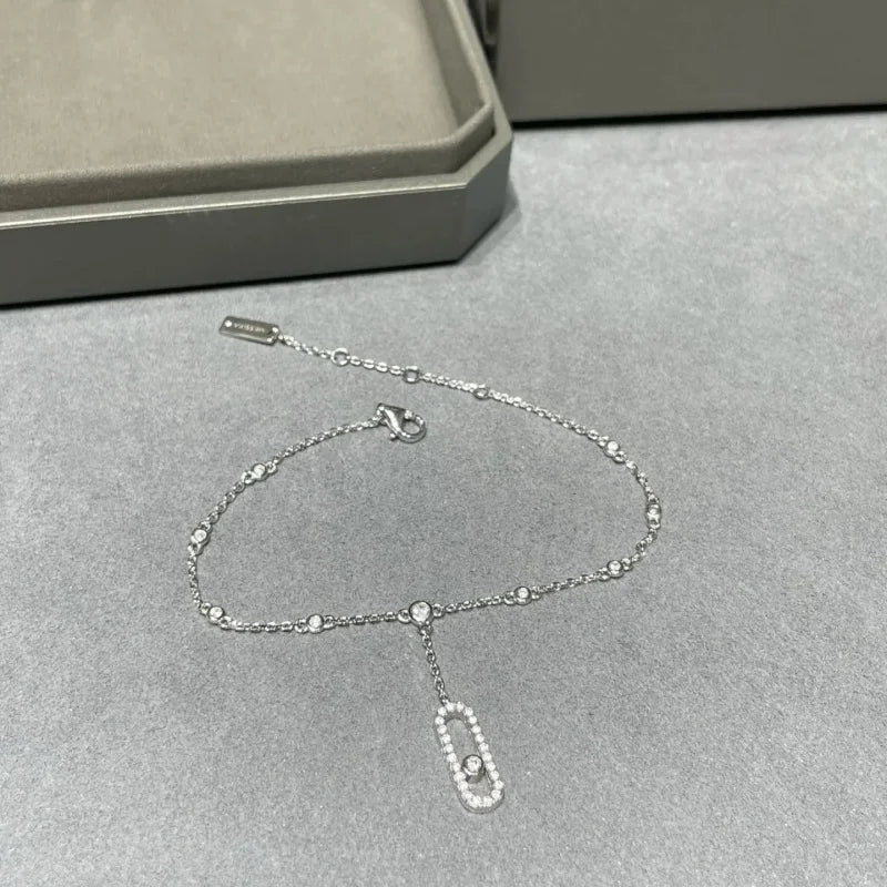 An adjustable anklet in certified 925 sterling silver, adorned with bezel-set zircons and a movable charm that shimmers with delicate fire. Lightweight and refined, it adds a subtle brilliance — perfect for daily elegance or as a graceful finishing touch for evenings.