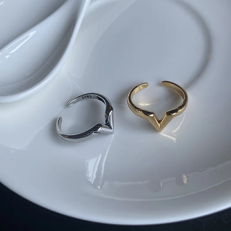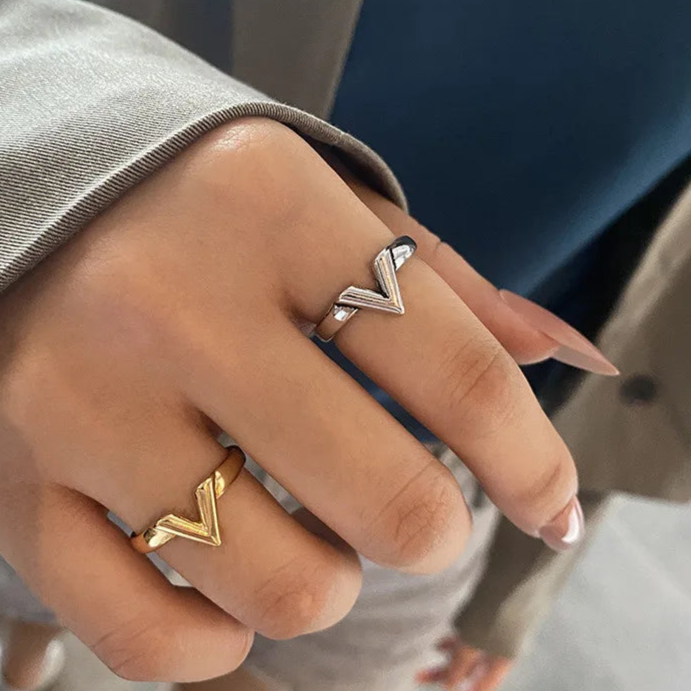 Crafted with triple-layer silver or gold plating, this adjustable V ring redefines minimalism through bold geometry. Allergy-free and skin-safe, its clean lines and versatile design make it perfect for layering or wearing as a modern statement.