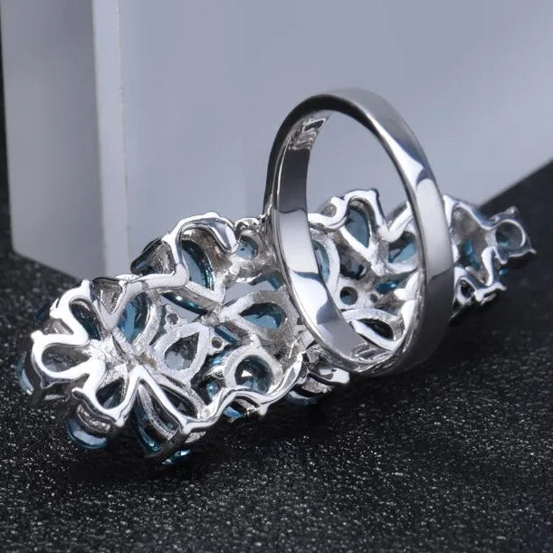 A luxurious botanical-inspired ring adorned with a rich London Blue Topaz at its heart, embraced by Swiss and Sky Blue Topaz side stones.