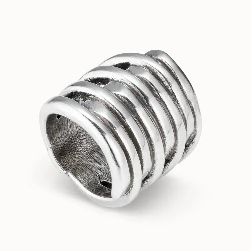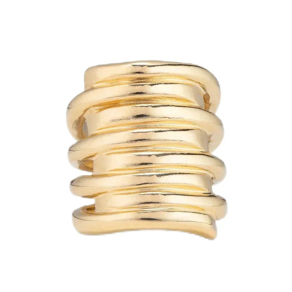 A sculptural ring shaped into layered organic bands, hand-finished with refined irregularity that echoes Spanish artistry.