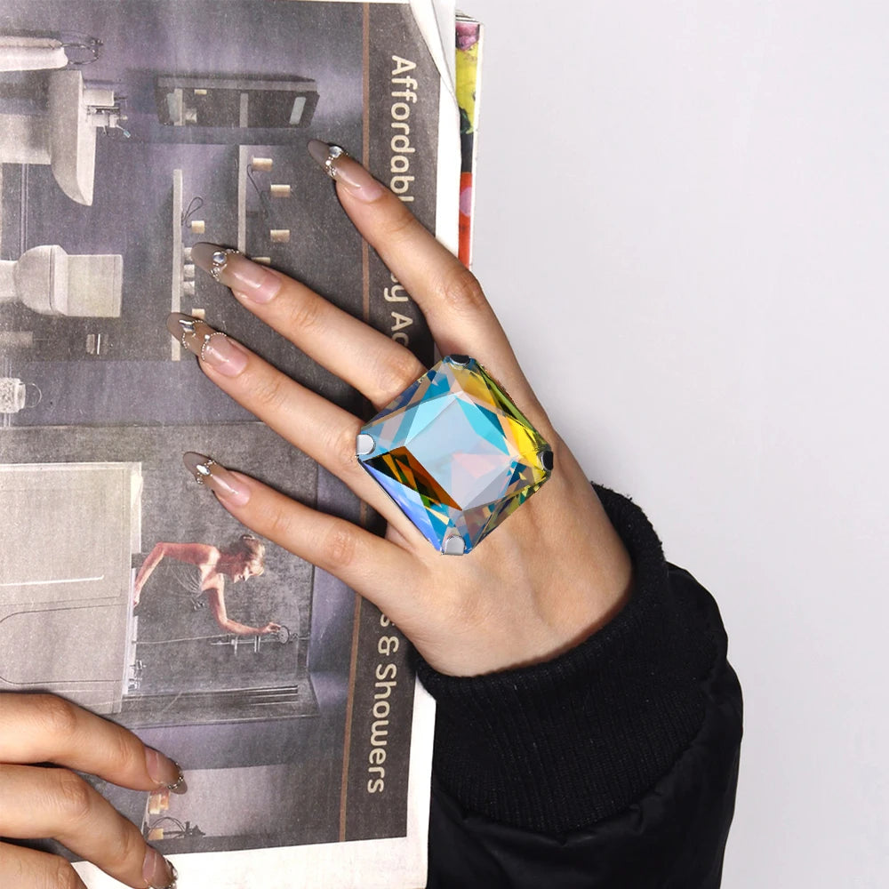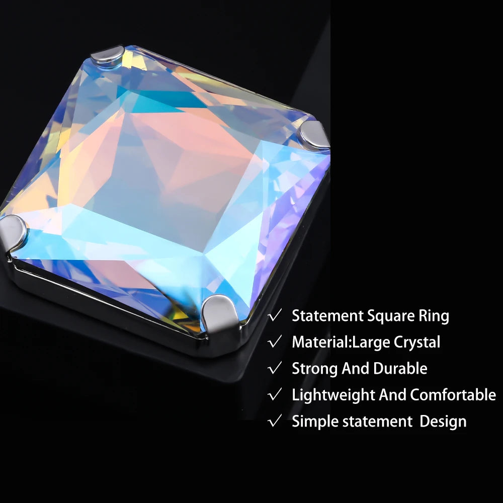 Auravéne is a bold statement ring featuring a large square-cut crystal centerpiece, prong-set for brilliance. Crafted in polished gold-tone metal, its adjustable open fit ensures comfort with dramatic presence. Glamorous and vintage-inspired, it’s made for parties, fashion moments, or unforgettable gifts.