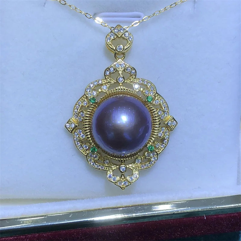 South Sea purple pearl in lilac tone, crowned with emerald-green and white zircon halo on 18K gold-plated silver. A rare pendant of timeless elegance, designed for unforgettable occasions.