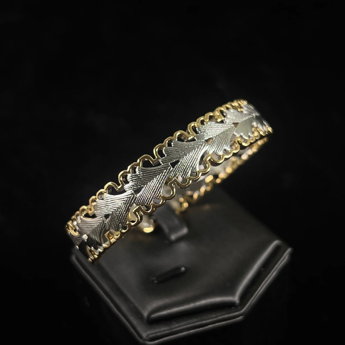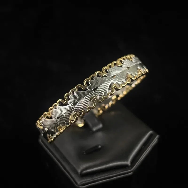 An open bangle sculpted with palace-cut detail, where platinum light meets golden warmth. Adjustable and refined, it lends quiet strength and effortless luxury to both day and evening wear.