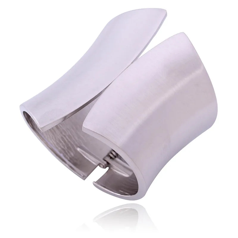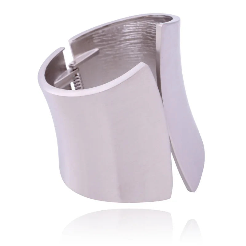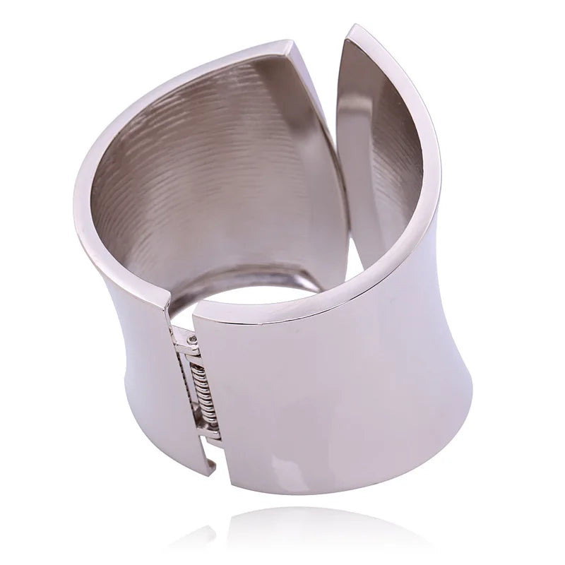 VELTORI Aurévolta is an oversized cuff bracelet crafted in gold-plated alloy with a sculptural brushed finish. Its spring-hinged closure ensures comfort and security, while its bold silhouette makes it a statement piece for modern elegance and power styling.