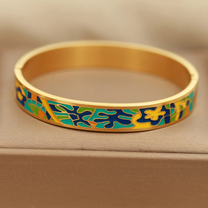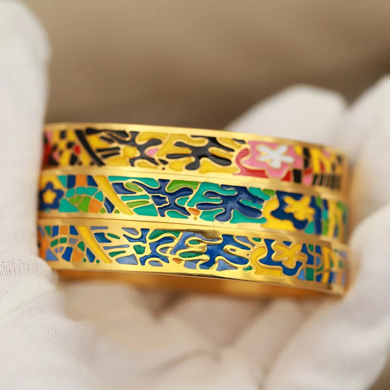 Stainless steel base with premium 18K gold plating Precision-filled multicolor enamel (fade-resistant) Anti-rust, hypoallergenic, long-lasting shine Smooth hinged closure for secure, comfortable wear Artistic geometric & floral enamel patterns