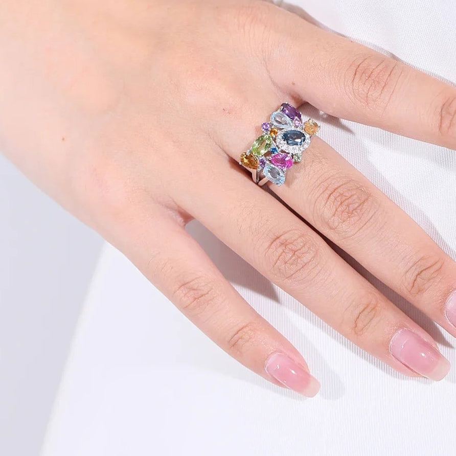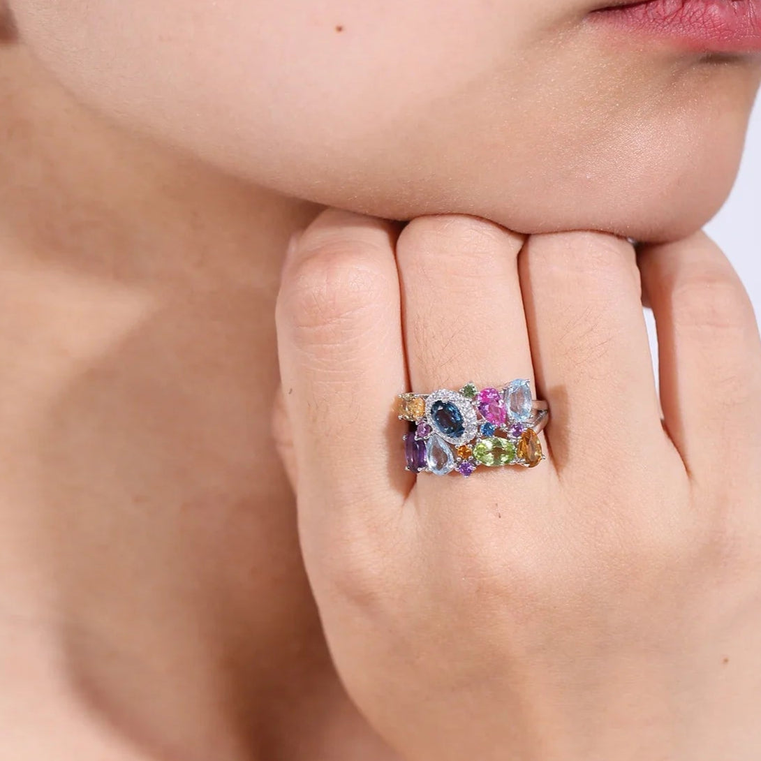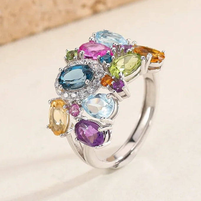 Auroria captures a garden of gemstones — citrine, amethyst, peridot, and blue topaz — blooming from polished sterling silver. Each stone glows in harmony, creating a vivid reflection of nature’s rhythm and refined artistry in motion.