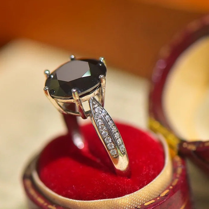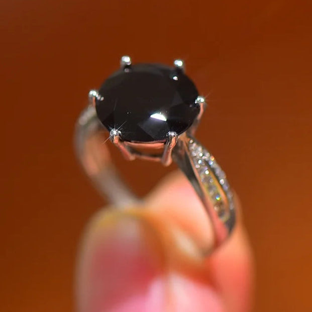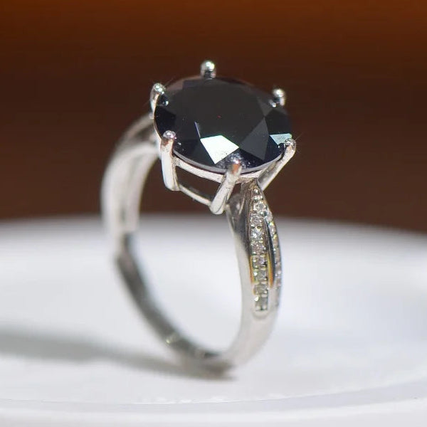 Center Stone: 5CT black moissanite, VVS1 clarity, round brilliant cut (GRA certified)