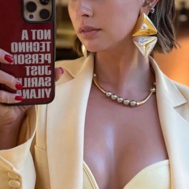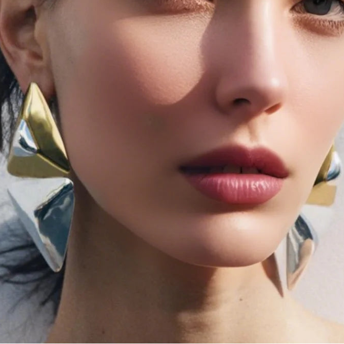 Striking two-tone statement drops with mirrored gold & silver triangles. Boldly sculpted for runway glamour or chic evenings, these geometric icons turn any look into modern art.