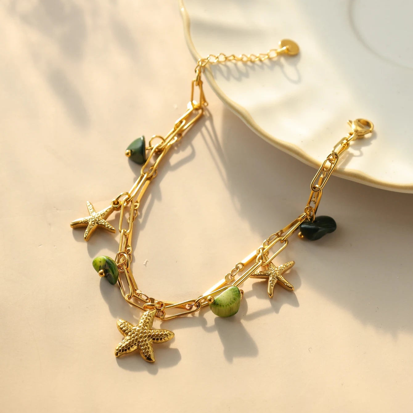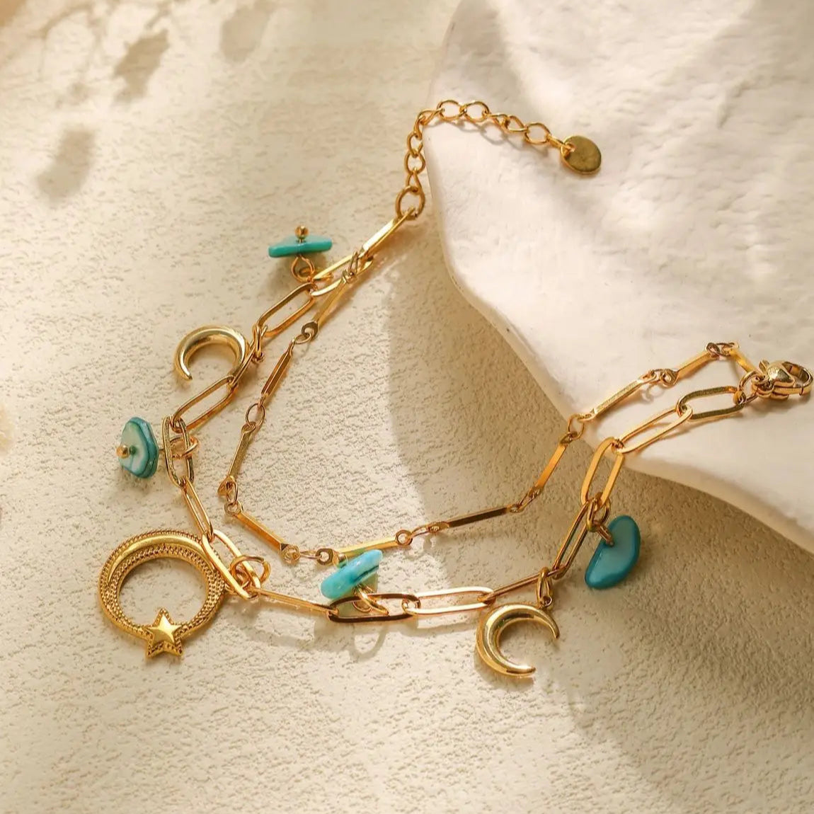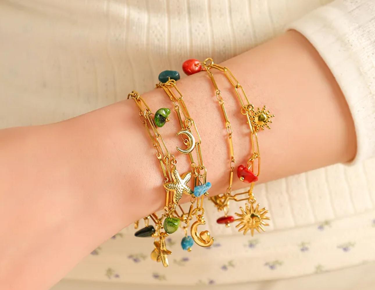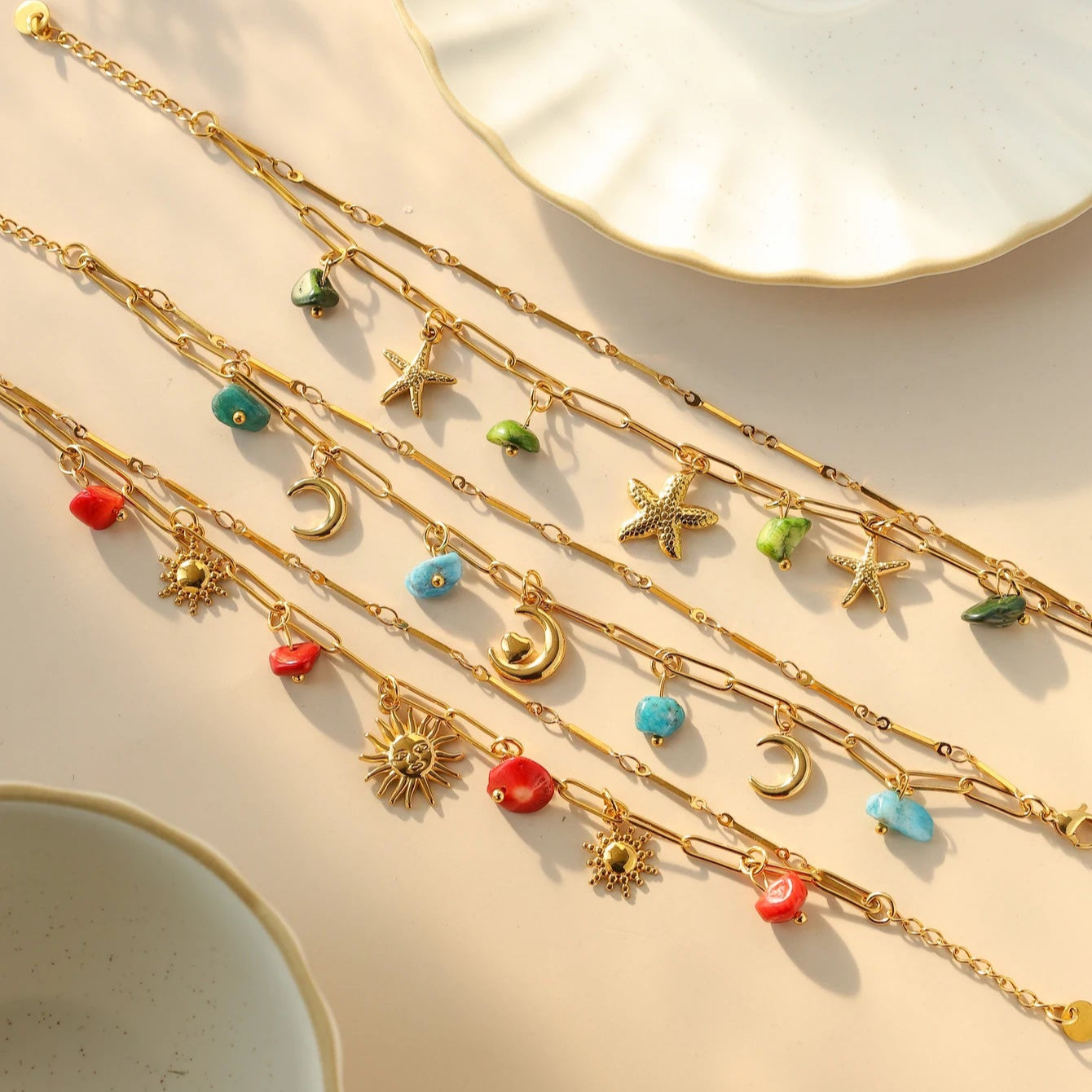 A double-layered bracelet adorned with sun, starfish, or moon charms, each paired with natural stones in radiant hues. Crafted from waterproof stainless steel and plated in gold, it flows effortlessly from beachside escapes to evening soirées.