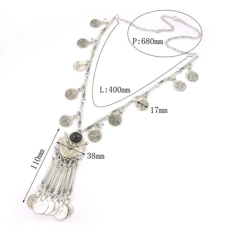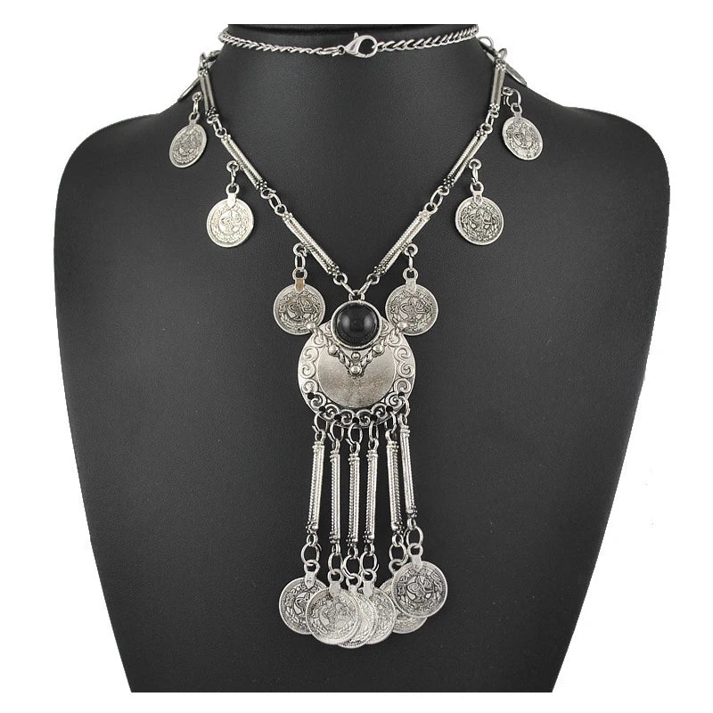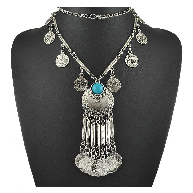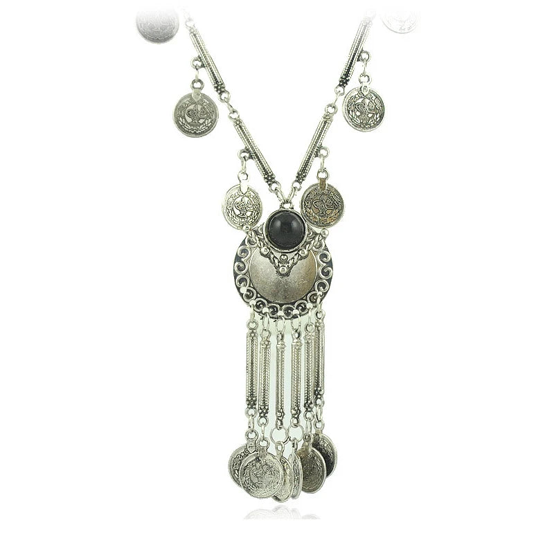 An antique silver-finish necklace with cascading coin charms and a central precision-cut crystal, available in turquoise or deep black. Bold yet elegant, it captures the rhythm of history and the spirit of modern bohemian luxury, designed for statement styling.