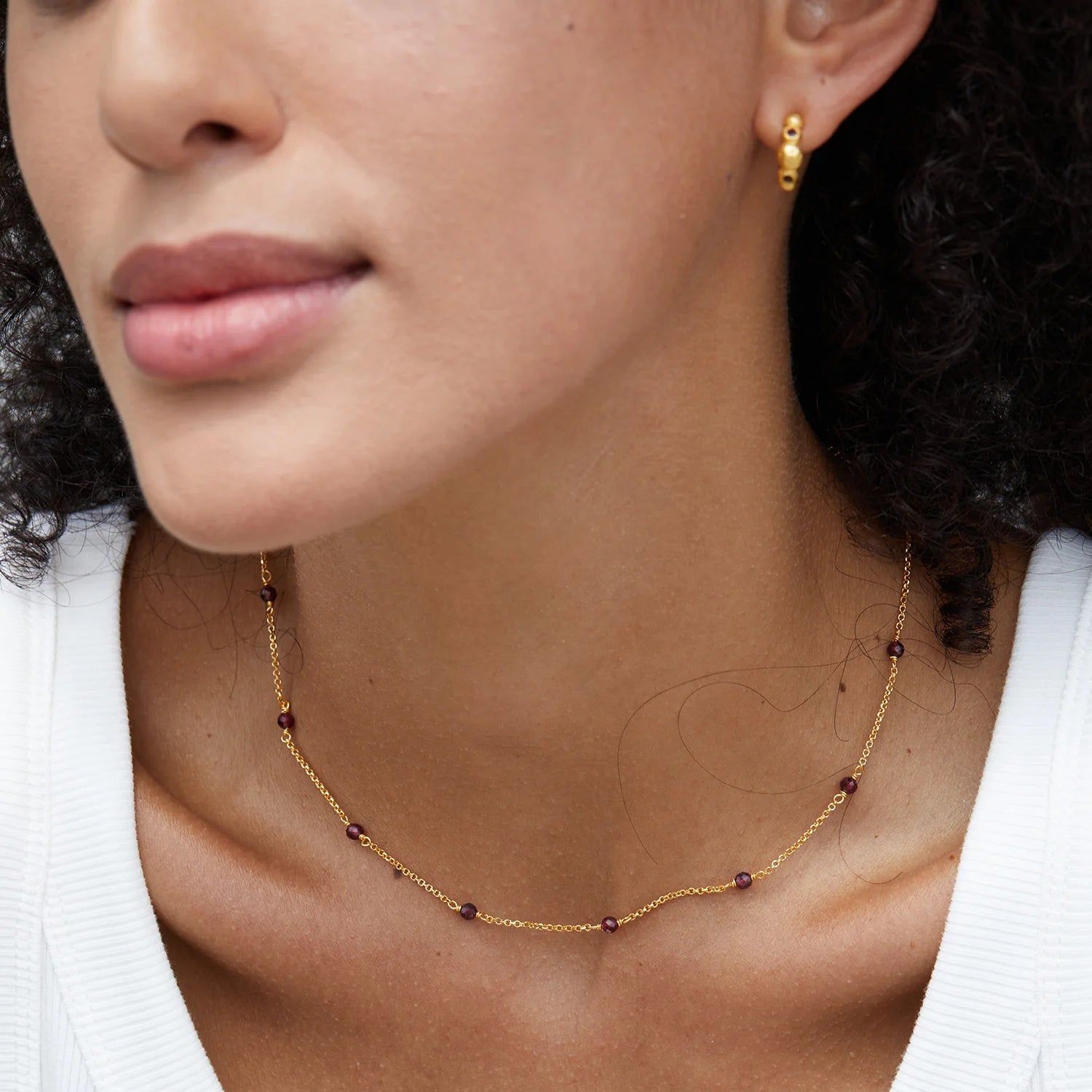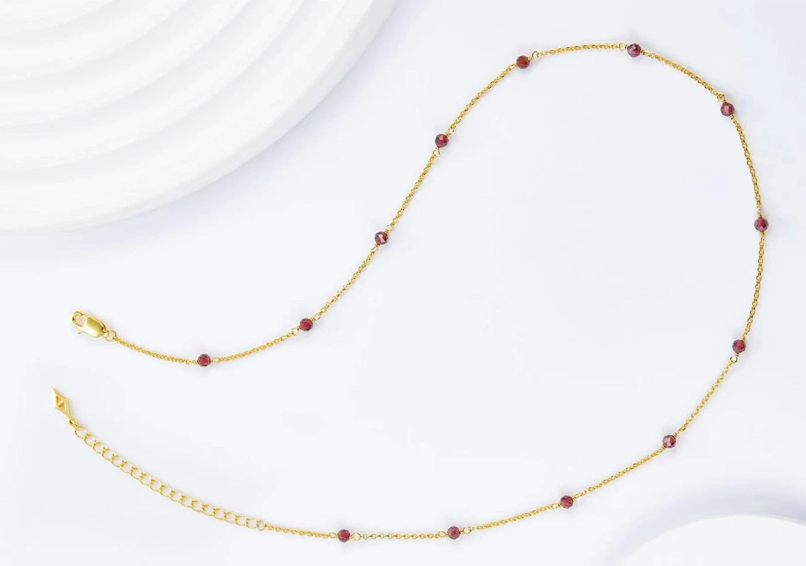 - Design: O-chain with spaced garnet beads