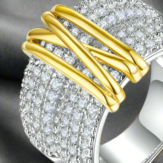 Handcrafted from solid 925 sterling silver, this wide band ring is fully encrusted with AAAAA+ zircon brilliance. Three golden crossover bars crown the pavé surface, blending modern artistry with timeless sparkle. Available in sizes 5–9, weight 7.1–8.2 g.