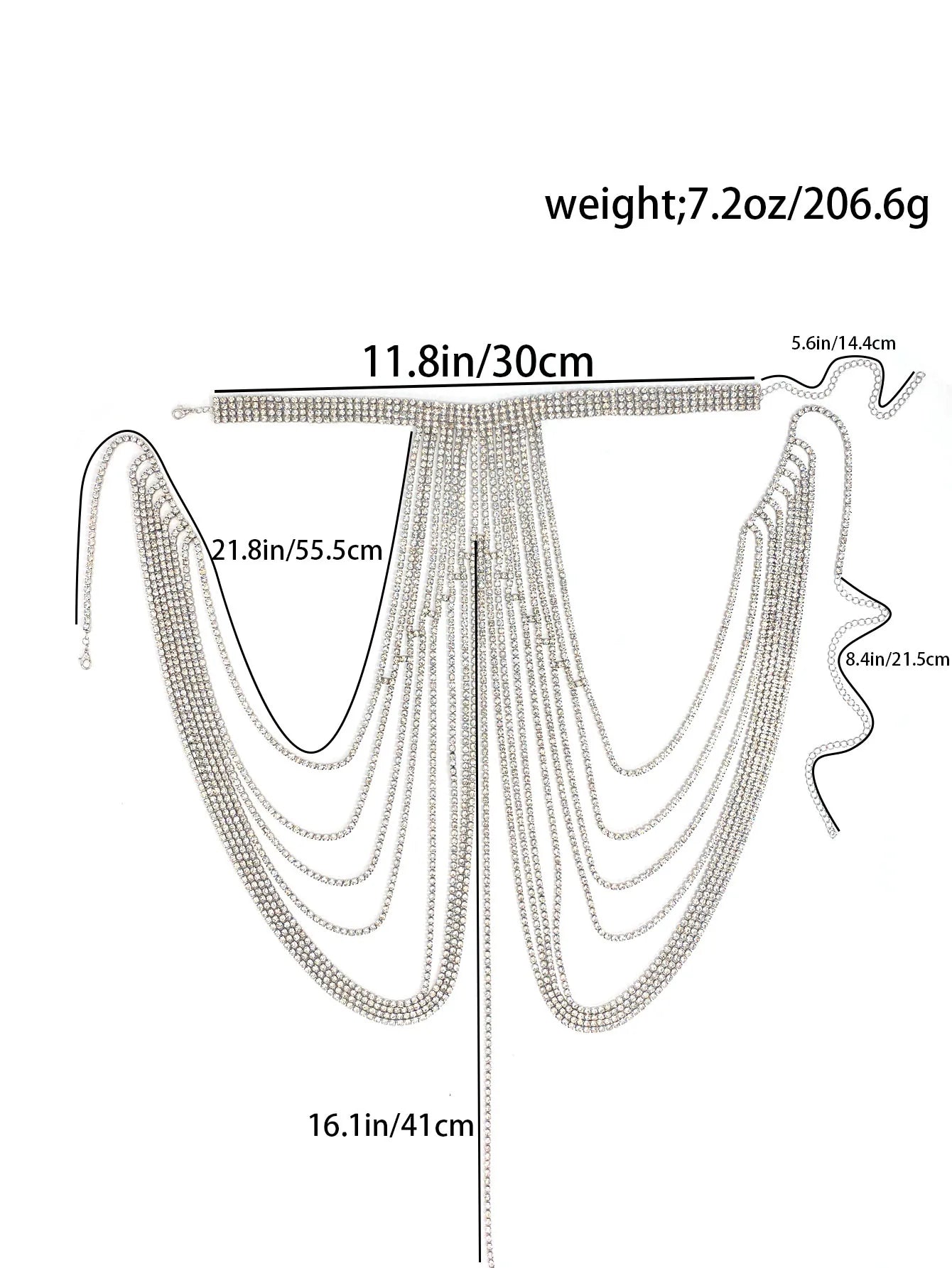 This dramatic crystal body jewel drapes the torso in luminous layers, shimmering with every move. Crafted with precision-cut crystals on a polished golden frame, it delivers bold elegance and stage-ready glamour. perfect for eveningwear, performance, or daring fashion statements.