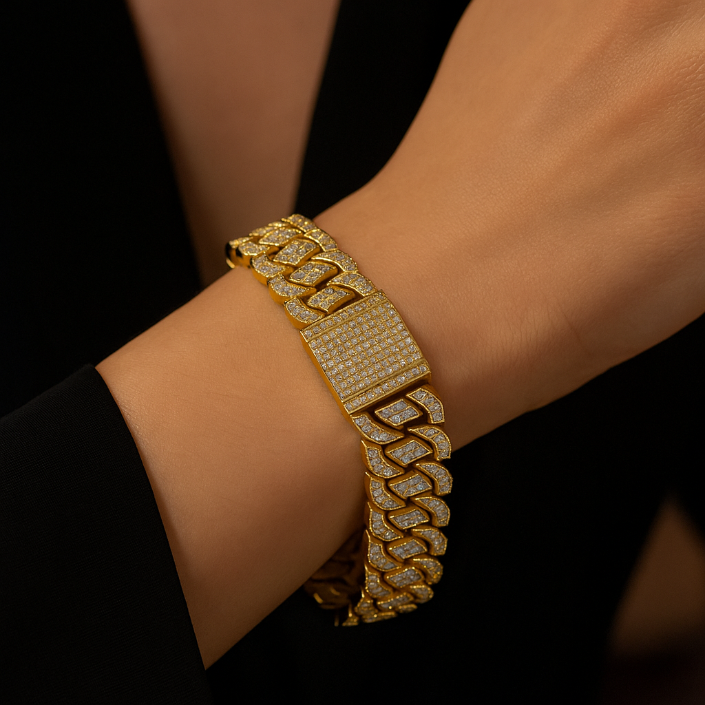Crafted in chunky 19 mm Cuban links, each bar-set with precision-cut cubic zirconia, this bracelet radiates unapologetic brilliance. With a high-shine finish and secure clasp, it’s designed for standout style — the perfect blend of street edge and luxury allure.