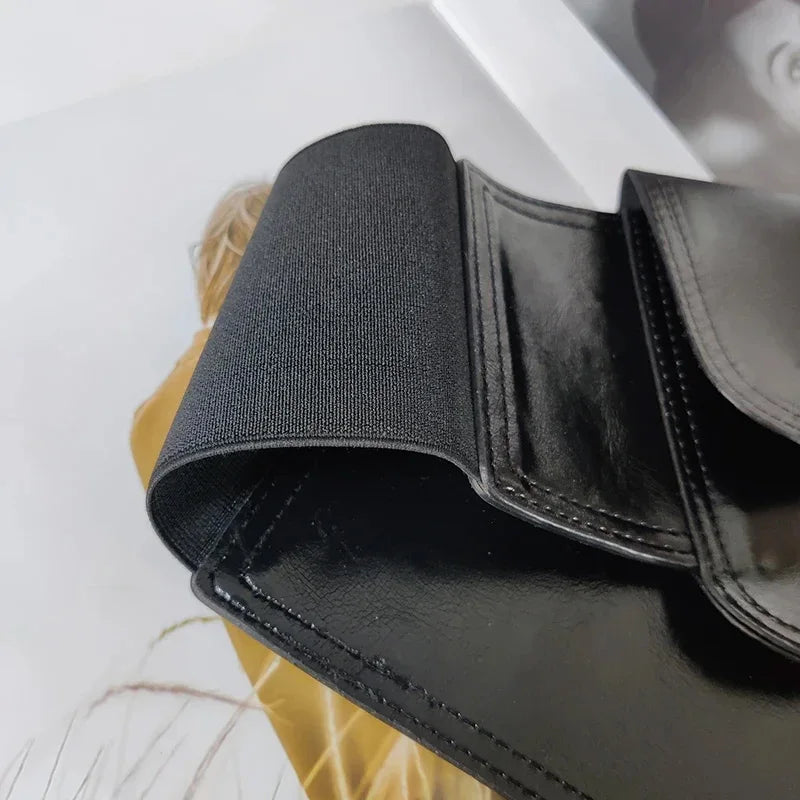 A wide black waist belt crafted in PU leather, elevated with a radiant gold “D” emblem and flexible stretch-fit. Designed to sculpt, accentuate, and empower every silhouette with timeless elegance.