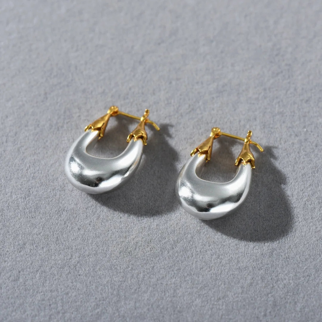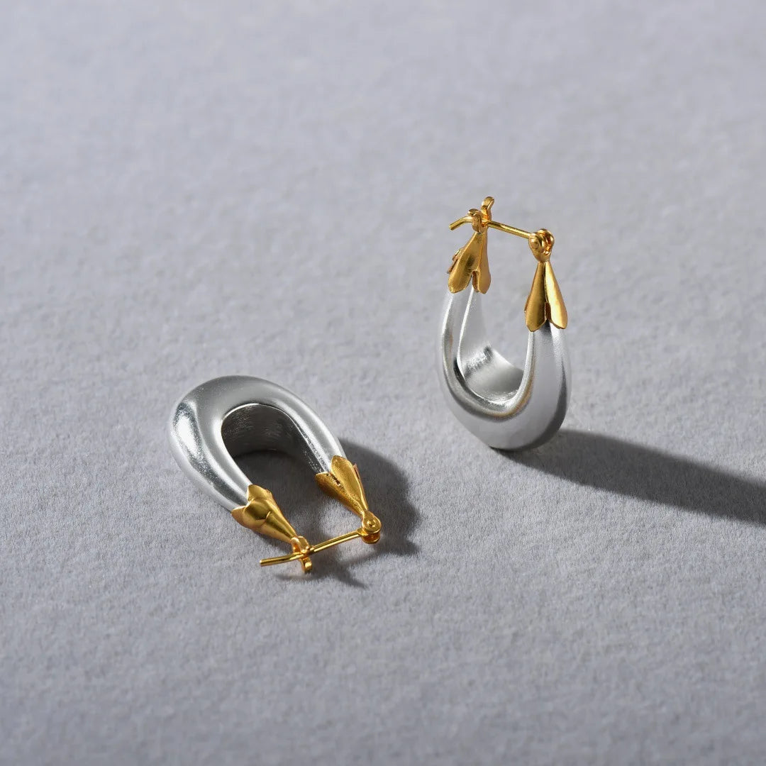 U-shaped earrings in dual-tone finish, crafted from gold-plated stainless steel with a refined brushed texture. Lightweight yet bold, their architectural silhouette brings contemporary artistry to both daily elegance and evening sophistication.