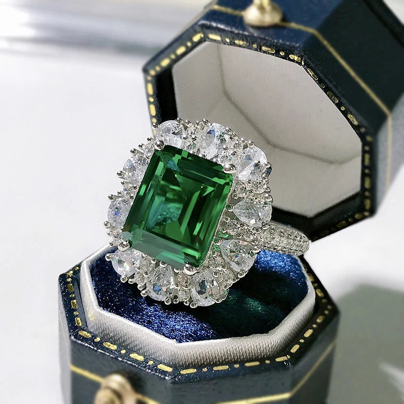 Crafted in solid 925 sterling silver (hallmarked), this statement ring showcases a 9×11 mm emerald-cut high-carbon diamond simulant at its center. Surrounded by a double halo of brilliant white stones and pavé-set band, it radiates bold clarity, elegance, and timeless grandeur.