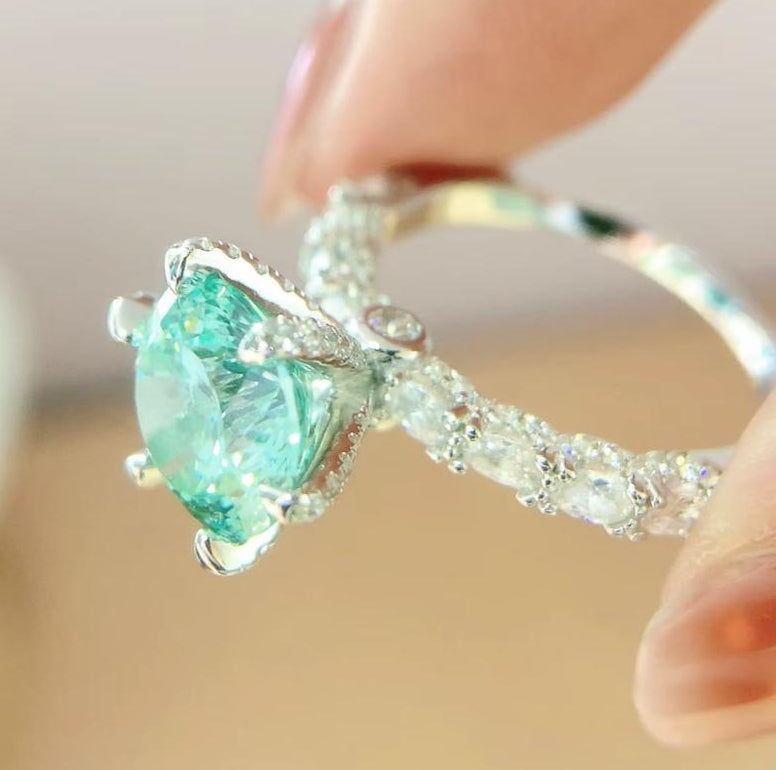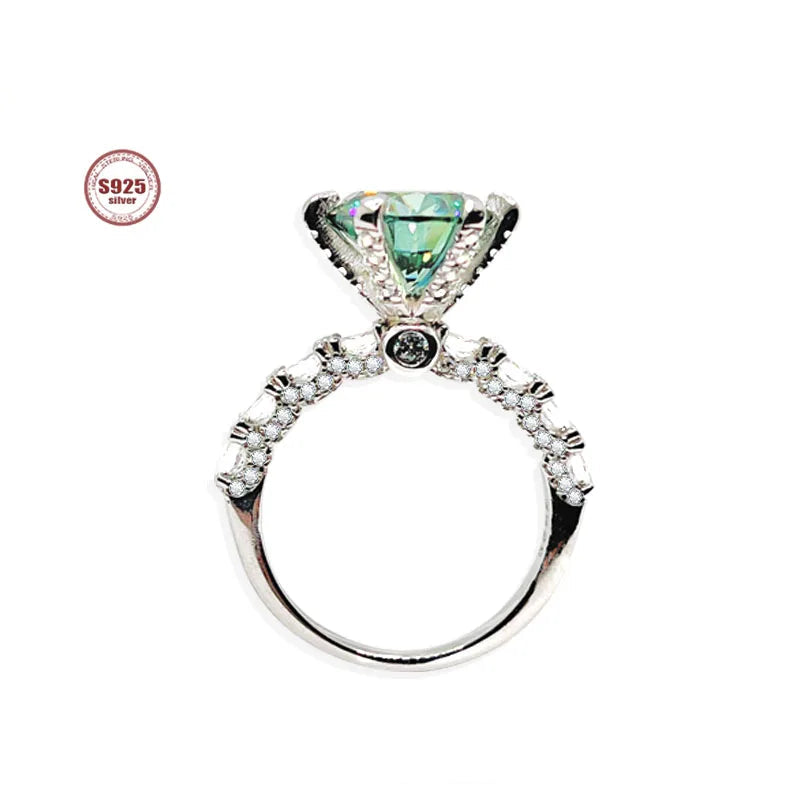 Handcrafted in rhodium-plated 925 silver, Émeraudelle radiates a 3ct emerald-green moissanite — GRA certified, flawless, and full of regal fire. Accented with zircon brilliance, it symbolizes harmony between strength and grace.