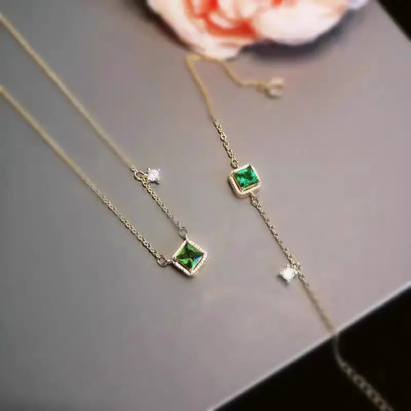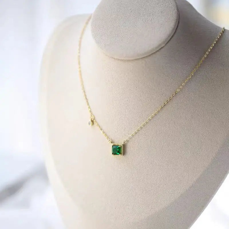 The Emerald Square choker is crafted from 925 sterling silver with 14K gold plating, featuring a 5×5mm square-cut zircon in an 8×8mm setting. Its adjustable 40+5cm chain (1.1mm thick) ensures comfort and versatility. Lightweight and timeless, it’s perfect for layering or elegant everyday wear.
