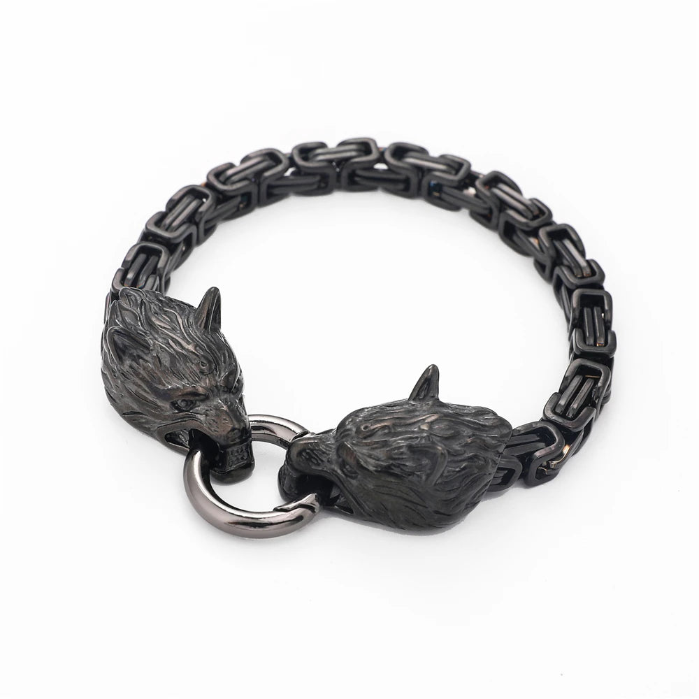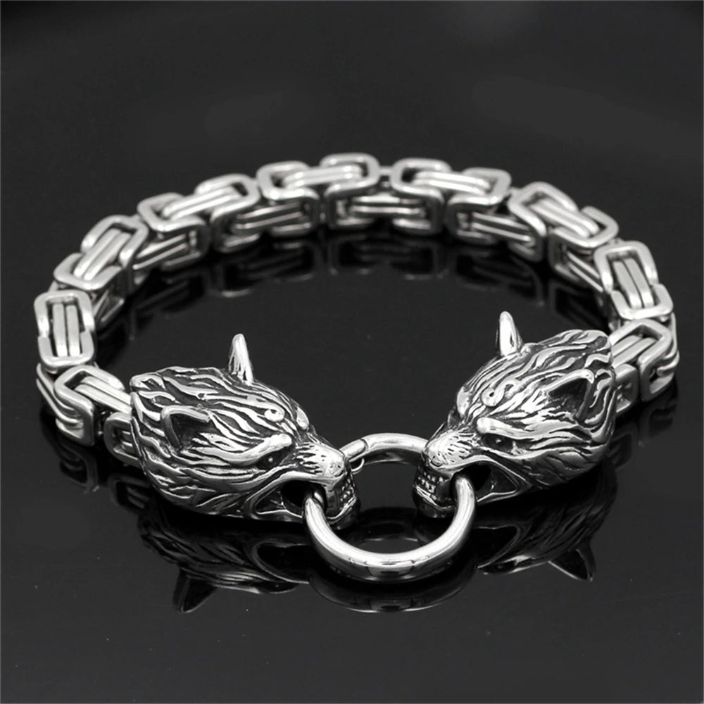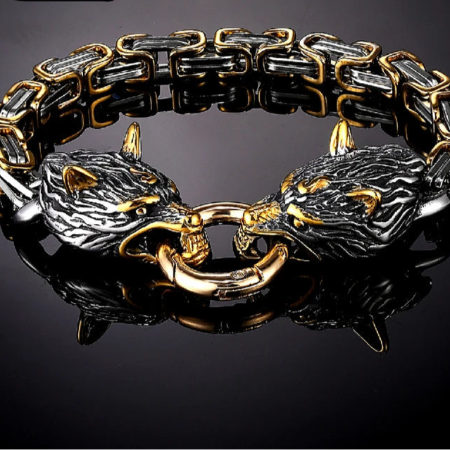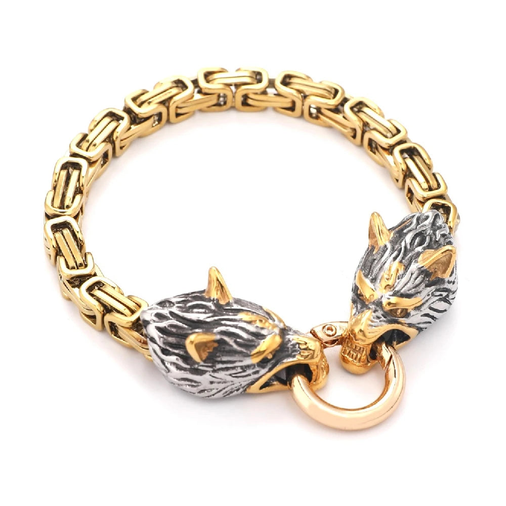 Type: Viking-inspired bracelet Material: Stainless steel, silver or gold-tone finish Design: King chain with detailed wolf head terminals Closure: Secure spring-ring clasp Lengths: 19cm, 21cm, 23cm