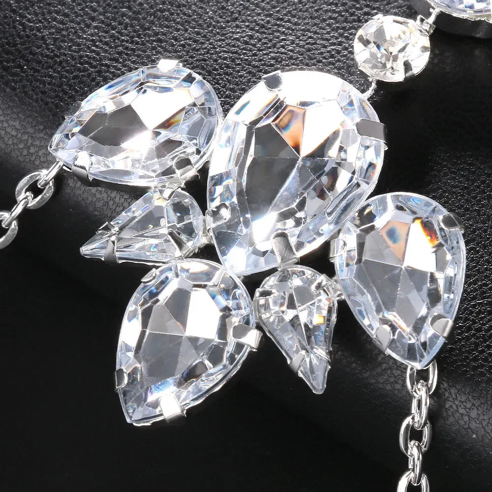 A dazzling body chain adorned with oversized faceted crystals in floral and teardrop cuts. Draping vertically across the torso, it catches every gleam of light. Lightweight yet commanding, it’s perfect for eveningwear, daring layered styling, or unforgettable stage moments.