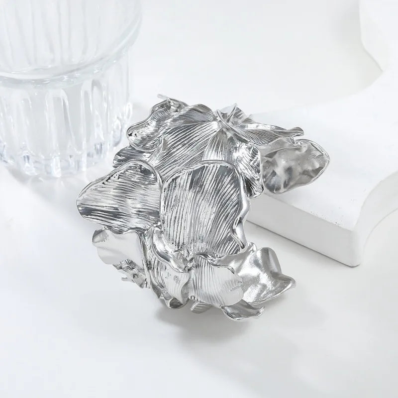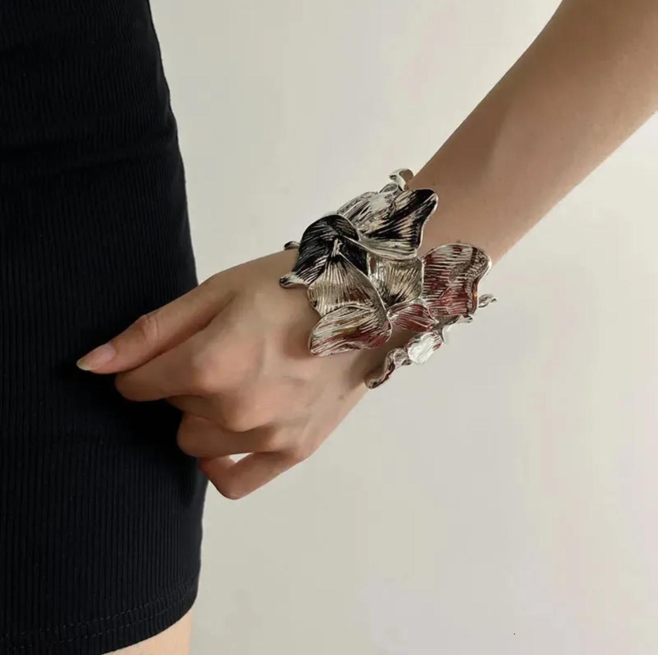 A bold floral cuff bracelet in radiant gold or silver finish. Oversized and artistic, it blooms with elegance—perfect for soirées, runway looks, or unforgettable gifting.