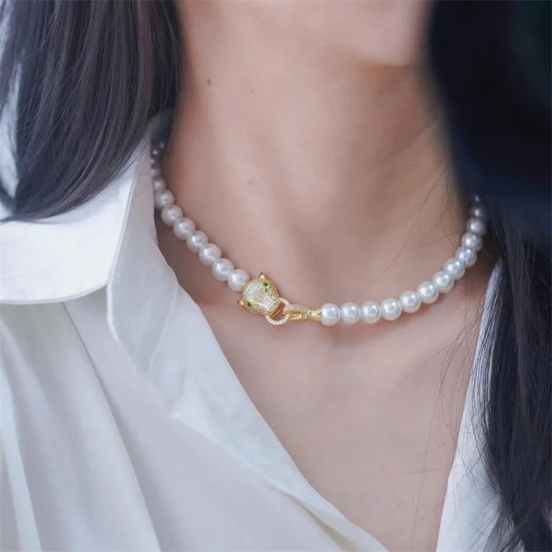 Hand-selected freshwater pearls meet a golden panther clasp. adorned with 5A zircon crystals and emerald-green eyes. A rare piece balancing wild strength with timeless sophistication, perfect for daily elegance or as an unforgettable gift.