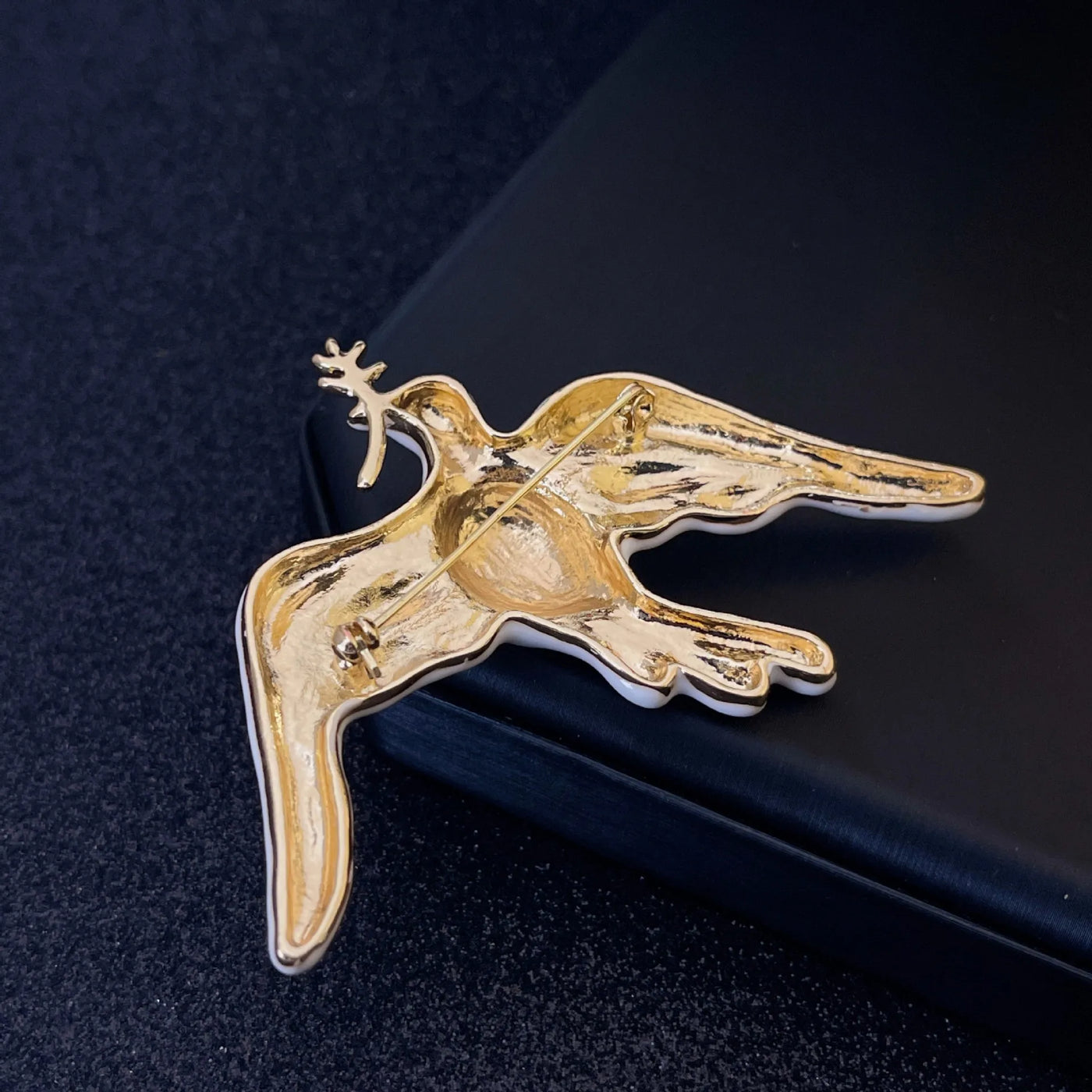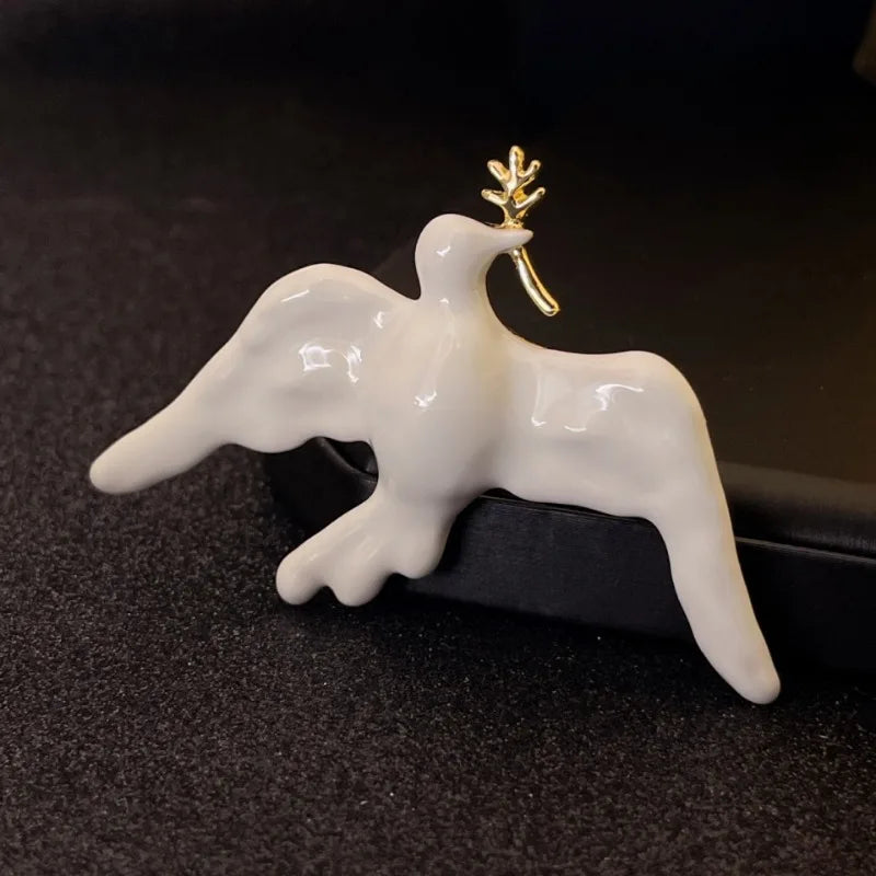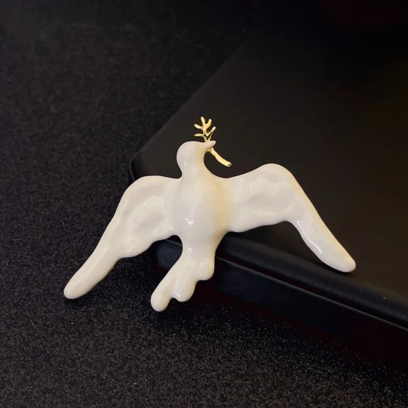 This sculpted dove brooch carries a golden branch, symbolizing serenity and timeless hope. Finished with white enamel glaze and framed in delicate gold plating, it adds poetic elegance to blazers, dresses, and refined ensembles.
