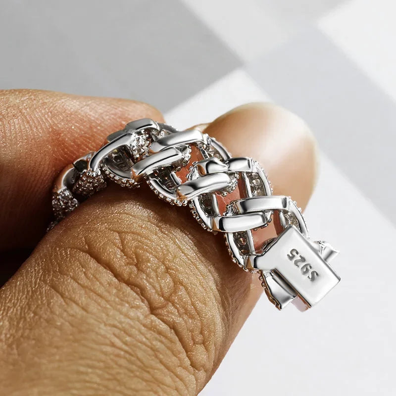 VELTORI GLACIERGRIP is a Cuban tennis bracelet in sterling silver with 18K white gold plating, 5A zircon brilliance, and a secure clasp hallmarked “925”. Bold and icy — built for parties, stages, and everyday swagger.
