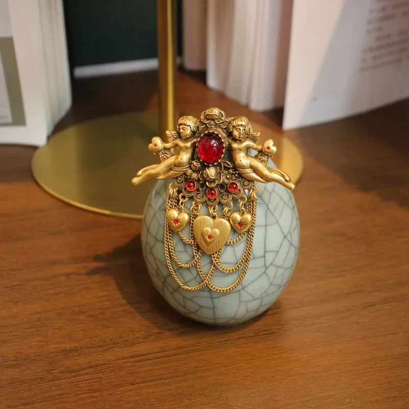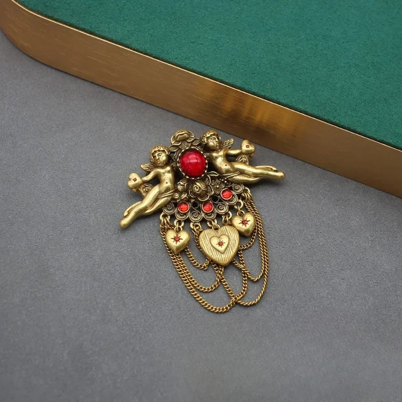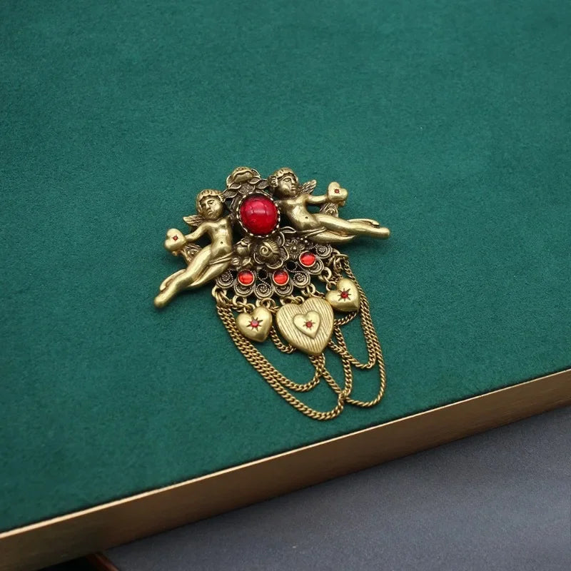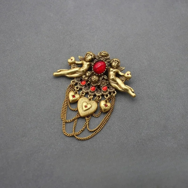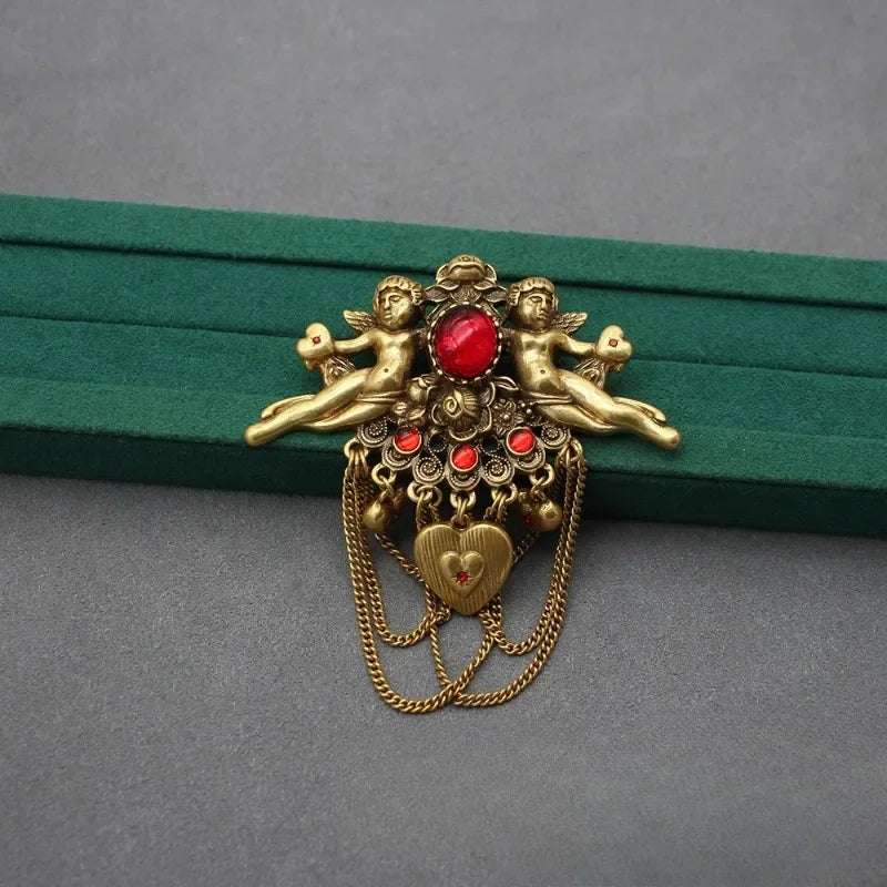 A palace-style brooch featuring twin cherubs guarding a deep red gemstone centerpiece. Rich gold-plated metal with intricate angel-wing motifs, heart silhouettes, and flowing tassel accents create a vintage aura of divine elegance. Limited Edition treasure.