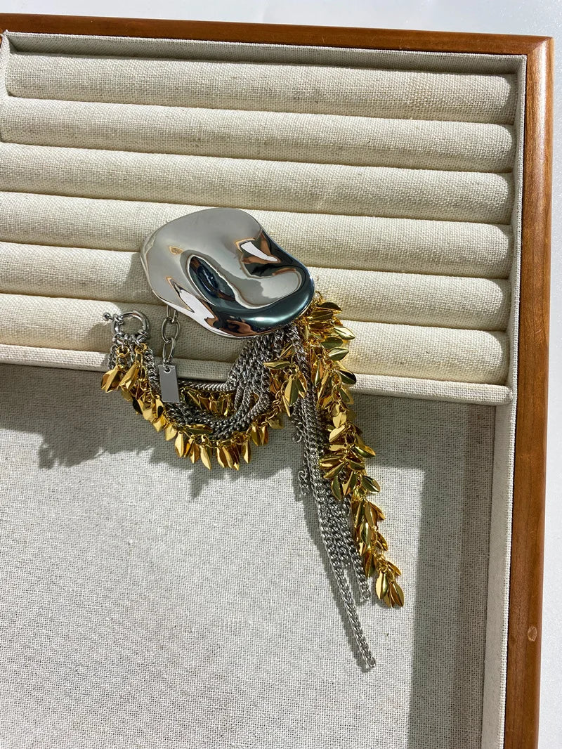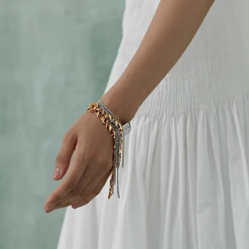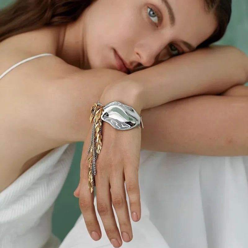A sculptural cuff bracelet merging silver polish with cascading golden chains. Its dynamic fringe of leaf-detailed links creates rhythm and radiance, while the adjustable open fit ensures comfort. A bold statement of contemporary artistry and timeless allure.