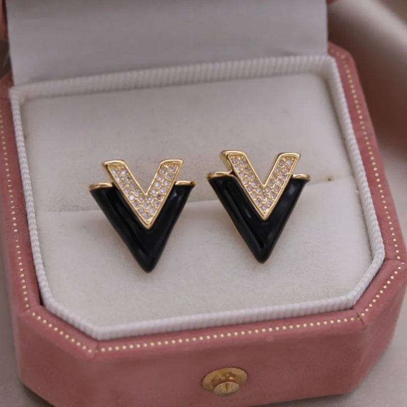Crafted in 14K gold-plated copper alloy, these twin V earrings fuse cubic zircon brilliance with rich enamel hues. Lightweight and chic with push-back closure, they reimagine minimalism through modern geometry. wearable in white, black, or brown enamel.