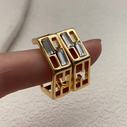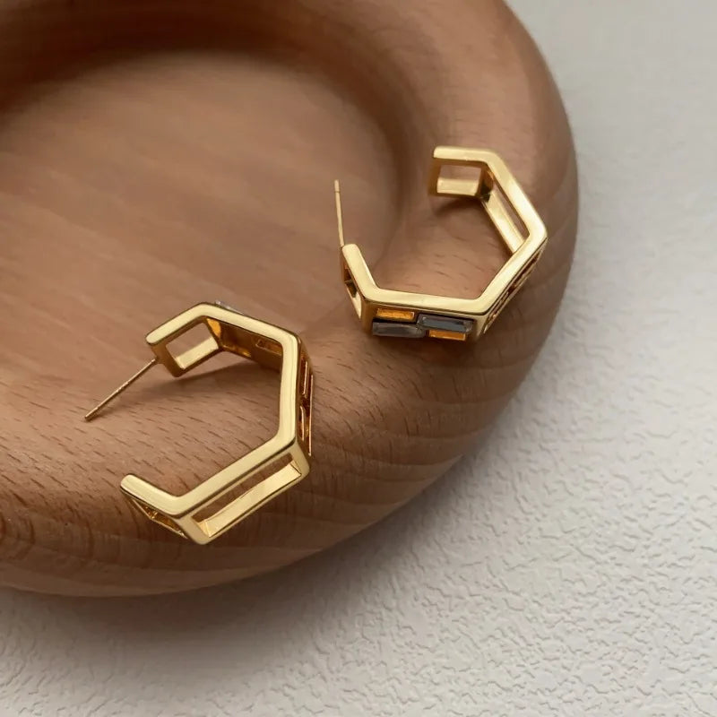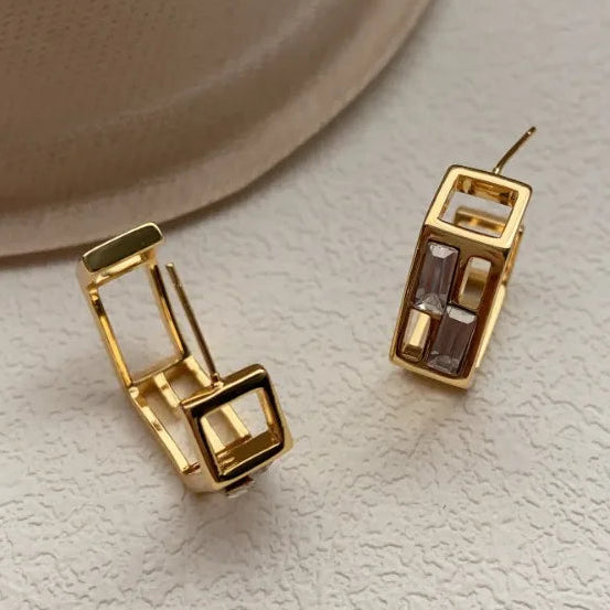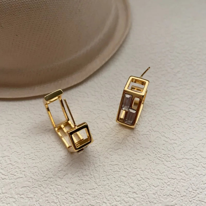 Modern geometric stud earrings plated in radiant gold, featuring openwork lines and baguette-cut zircon accents. Lightweight and versatile, they blend architectural elegance with a touch of sparkle for day-to-night sophistication.